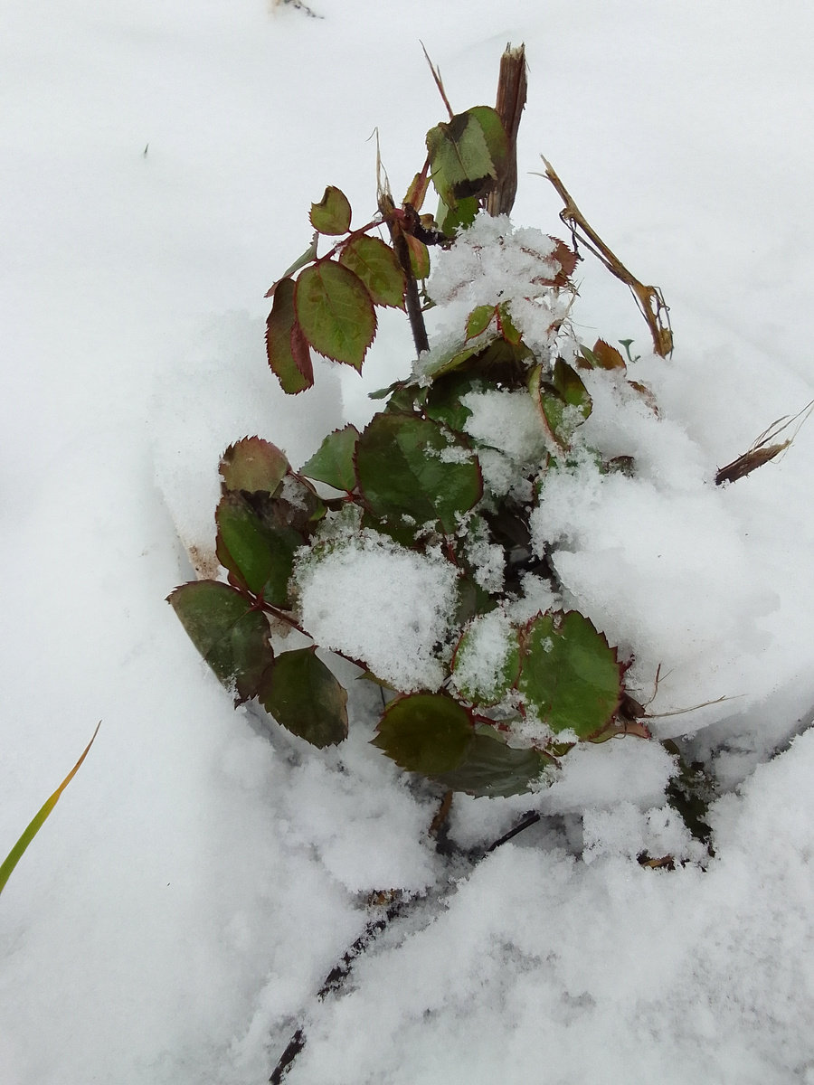 Воскресенье, 1 декабря. Зима! Чем, заняться, казалось бы, зимой на усаде? Отдыхать. Вот и гуляю по саду, как воевода. Обхожу владения свои. Нашла розочку в снегу. Скорее всего, укрытие ураганом снесло. Розочка живая, листва свежая. Укрыла.