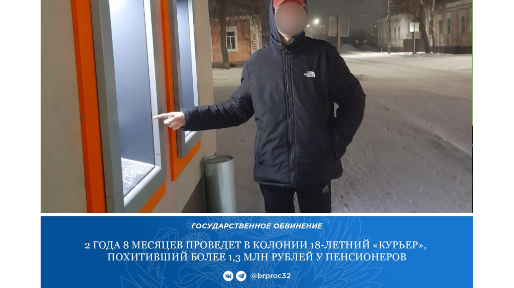 В Погаре вынесли приговор по уголовному делу в отношении 18-летнего жителя Дятьково. Его признали виновным в мошенничестве, сообщает пресс-служба надзорного ведомства Брянской области. В феврале в поисках подработки разместил объявление на популярном сайте. Спустя некоторое время на него вышел «работодатель». В его задачи входил приём «наличных» и их дальнейший перевод на продиктованные счета. Из требований – только наличие карты определенного банка. В качестве оплаты ему был обещан 1% от суммы денег, которые он будет забирать. Итог: жертвами преступной группы «телефонных» мошенников, которые звонили пожилым людям, вводя в заблуждение о необходимости передачи денежных средств, стали четыре пенсионера из Погарского, Суземского и Стародубского районов. Общая сумма причиненного ущерба превысила 1,3 миллиона рублей. Суд приговорил виновного к 2 годам 8 месяцам колонии общего режима. Решение не вступило пока в законную силу. В Брянске 18-летний курьер мошенников обманул пенсионеров на 1,3 м