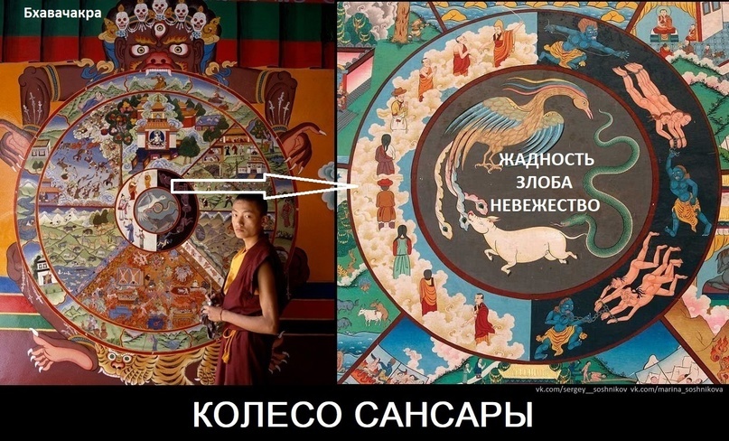 Наверное, самым впечатляющим изображением колеса жизни является Бхавачакра (колесо взаимозависимого происхождения). В центре изображения расположено колесо, которое символизирует сансару. Его крепко когтями держит бог смерти – Яма.