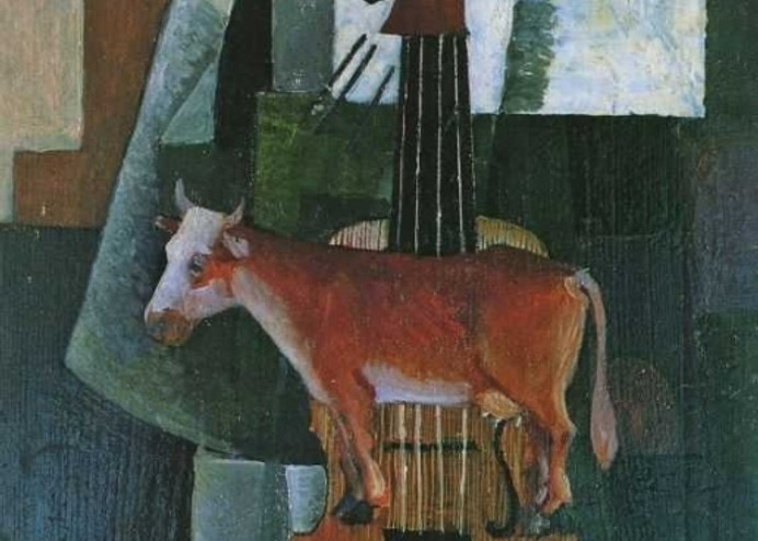 В этой картине все неожиданно и алогично, хотя для своего времени такой контраст — не такая уж и редкость. В 1913 году разрушение и гибель старых форм — довольно привычный контекст. И все же для задержавшихся в прошлом требовались объяснения. «Алогическое сопоставление двух форм — это «момент борьбы с логизмом…» — укажет Малевич на оборотной стороне своей картины «Корова и скрипка». Летом 13-го года художник живёт в Кунцеве на даче, где пишет на деревянных полках разломанной этажерки три разные картины. Почему на досках? Чтобы не тратиться на холсты. Интересующий нас сюжет — центральная часть кунцевского триптиха. На кубо-футуристическом фоне из разных объемов изображена огромная скрипка, бесконечно любимая в те же годы Пикассо и Браком. Верхнюю часть корпуса ее перекрывает небольшая корова, как будто с вывески мясной лавки. Или с какой-то картинки. Неважно, само соседство слагаемых, их размеры и стиль — всё здесь говорит о контрасте. Для Малевича — это как раз то, что и надо. «Интуити