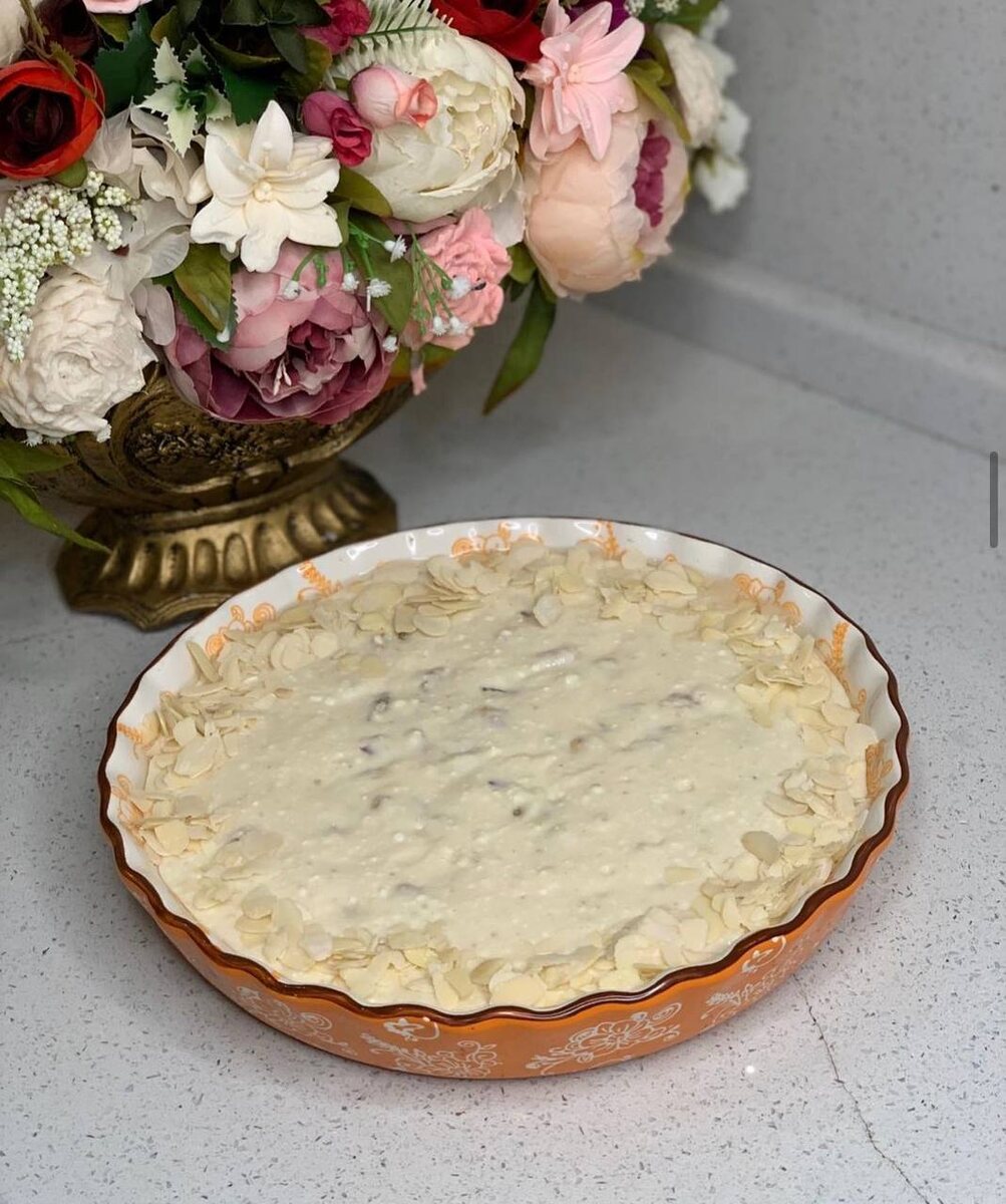 Украсьте миндальными лепестками и отправьте в духовку на 180° 45 минут.