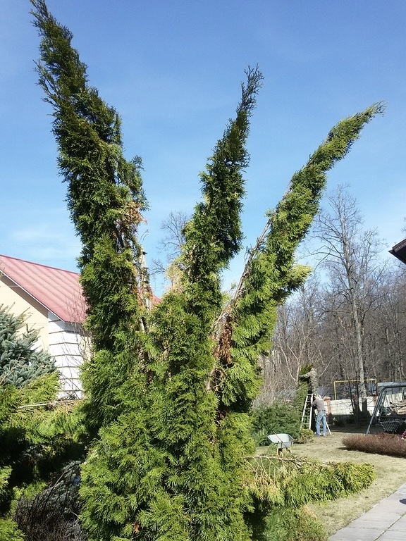 Вообще, если честно, я туи обожаю! Прекрасные создания. Изящные, эффектные, относительно небольшие растения. Множество сортов разных форм и размеров. Чудо! Но когда очередной заказчик требует: «Вот тут, тут, и там еще везде вдоль заборов туйки в рядочек!», у меня начинает дергаться глаз. Или оба. Нет, есть моменты, когда высокая живая изгородь из хвойных необходима. Например, когда места очень мало, а закрыться нужно. Вдоль бассейна тоже лучше размещать именно хвойные, чтобы меньше листвы попадало в воду. Но иногда складывается ощущение, что туи в ряд - неотъемлемая и непреложная часть участка, без которой просто немыслима загородная жизнь. В чем проблема? Их несколько. Во-первых, зеленый забор - это тот же забор. Да, немного приятнее, чем голый профлист, но в стремлении сделать забор невидимым мы только подчеркиваем его, отнимая при этом полезное место у других посадок. Во-вторых, туи регулярно получают повреждения зимой. Их разваливает и ломает снегом. На освещённом месте они частень
