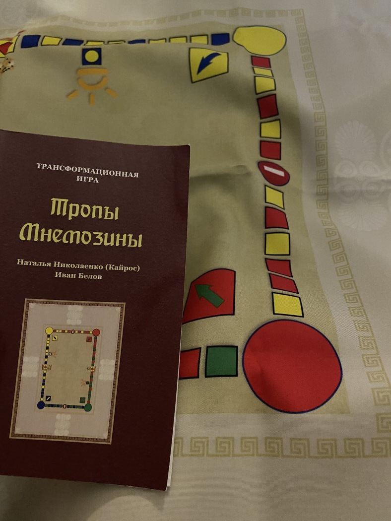 С трансформационной игрой Тропы Мнемозины мы познакомились случайно, и это была любовь с первого взгляда. Игра не очень известная, я бы даже сказала - для узкого круга любителей. Ну и раз я именно такой любитель, скоро коробочка с игрой оказалась у меня. Мнемозина — древнегреческая богиня памяти, мать девяти муз. Мне нравится само название игры, словно мы исследуем тропы, не просто узнаем какую-то информацию, а скорее вспоминаем ее про себя же. Как и все гениальное, игра выглядит очень просто. А наполняет ее, конечно, ведущий и сами игроки. Начинается все с подготовки поля. Оно выглядит вот так. Также раскладываются карты из специальной колоды Симболон (созданы психотерапевтом и основаны на архетипах). Карты располагаются на позициях Старт и Цель, то есть вы получаете послание-подсказку о корнях проблемы, а также карту в конце игры, как некое резюме. После подготовки игроки определяются с запросом. Это может быть что угодно, например "что мне мешает начать практиковать, как психолог" и