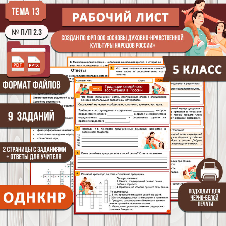 Рабочий лист «Традиции семейного воспитания в России» создан специально к уроку ОДНКНР в 5 классе. Состоит из 4-х страниц: 9 интересных заданий размещены на 2-х страницах + 2 страницы отведены под ответы для учителя. Материал создан по теме 13 ФРП ООО «ОДНКНР для 5 классов», тематический блок 2. «Семья и духовно-нравственные ценности» № п/п 2.3. Представлен в двух форматах: PDF и PPTX (можно редактировать). Содержание заданий: Рефлексия. Данный рабочий лист можно скачать тут. Кроме того, вот здесь можно скачать презентацию «Традиции семейного воспитания в России» для 5 класса к уроку ОДНКНР (20 слайдов). Рабочий лист «Традиции семейного воспитания в России» ОДНКНР 5 класс подходит для печати на чёрно-белом принтере (в карточке товара представлен пример данного рабочего листа в черно-белом цвете). #однкнр #однкнр5класс #презентация #5класс #рабочийлистоднкнр #образование #рабочийлист