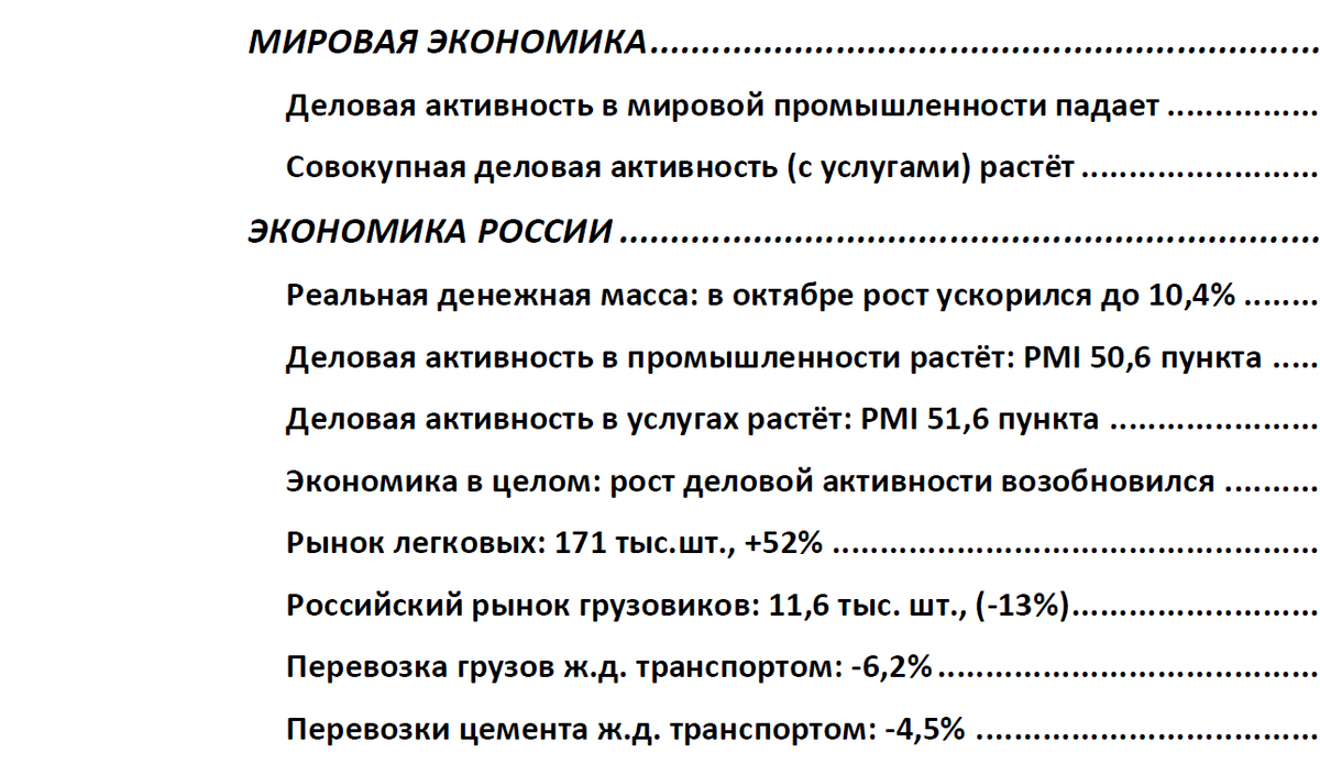 Композитный индекс PMI (промышленность + услуги) в сентябре составил 49,4 пункта. Это говорило о падении деловой активности в экономике России в целом. В октябре индекс вновь поднялся выше 50 пунктов, это означает, что деловая активность вновь растёт.