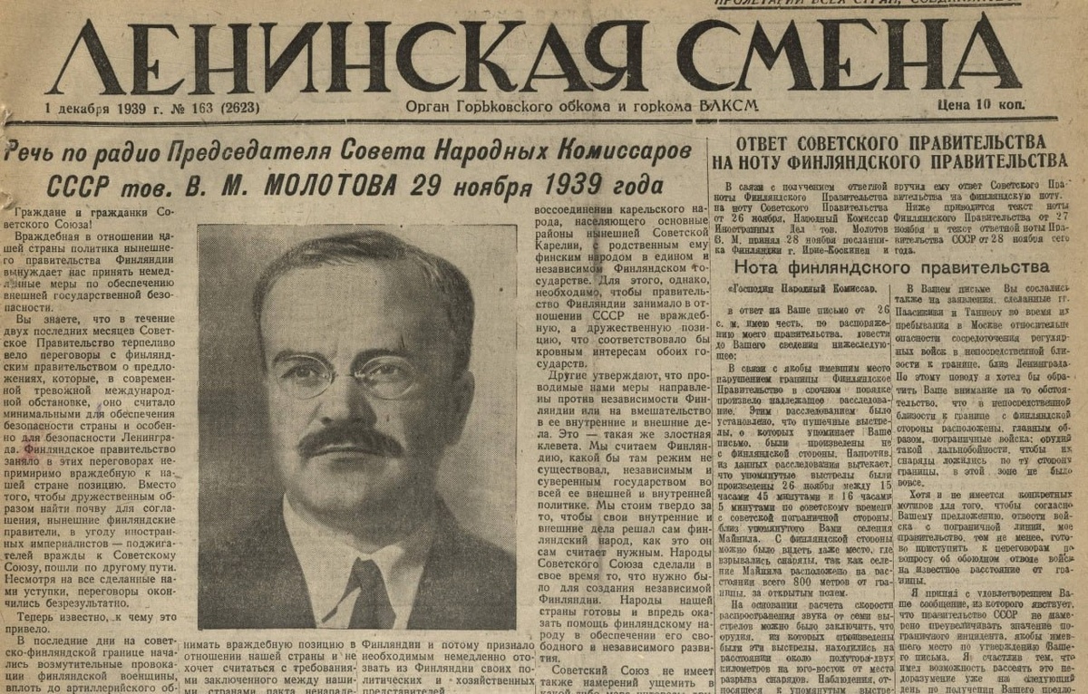В полдень 30 ноября 1939 года все советские люди собрались возле уличных репродукторов и домашних «тарелок». Передавалось важное правительственное сообщение, которое зачитывал нарком иностранных дел Вячеслав Молотов. «По приказу Главного командования Красной армии, ввиду новых вооруженных провокаций со стороны финской военщины, войска Ленинградского военного округа в 8 часов утра 30 ноября перешли границу Финляндии на Карельском перешейке и в ряде других районов», – сказал он.