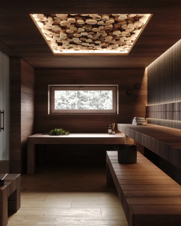 Сауна с окном, оригинальным потолком из натурального дерева, с подсветкой по потолку и стенам, погружает в атмосферу уюта и расслабления. Свет мягко рассекает тени, проявляя текстуру дерев, которая играет на поверхности, добавляя особую теплоту пространству. Оригинально обыграна печь, выполненная в облицовке из талькохлорита с подсветкой с двух сторон. Ее элегантная форма и продуманная цветовая гамма контрастируют с натуральными текстурами, привнося элемент современности. На стенах мягко переливаются оттенки, подчеркивающие изысканную отделку, а деревянные элементы создают ощущение близости к природе. Ароматы трав и масел наполняют пространство, дополняя гармонию и уют. Здесь можно наслаждаться чтением или просто созерцанием. Эта сауна становится не просто местом для оздоровления, а оазисом для души, где каждая деталь продумана для максимального комфорта.