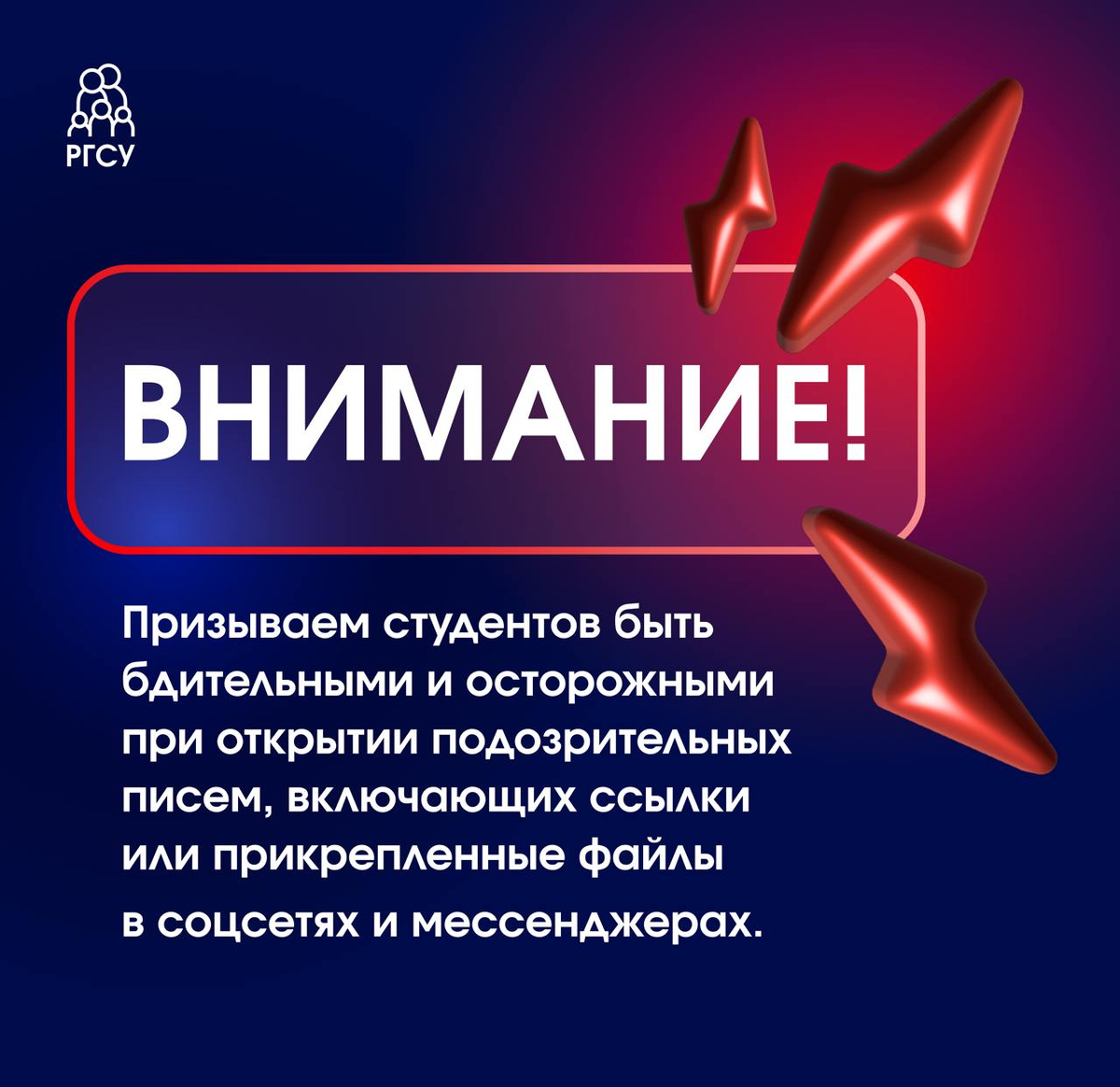 Хотим обратить ваше внимание на участившиеся случаи, связанные с рассылкой в мессенджерах недостоверной информации от различных источников. Мы призываем студентов быть бдительными и осторожными при открытии подозрительных писем, включающих ссылки или прикрепленные файлы. Если вы получили письмо, которое считаете спамом или фейковой информацией, пожалуйста, не отвечайте на такие сообщения и не переходите по подозрительным ссылкам. С уважением, команда РГСУ.