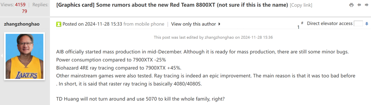 Последний слух о графических процессорах AMD RDNA 4 сегодня появился от участника форума Chiphell, zhangzhonghao, который ранее раскрыл даты запуска Ryzen 7 9800X3D, оказавшиеся точными, а также поделился информацией о будущих графических процессорах AMD, таких как линейка UDNA следующего поколения. В своем последнем сообщении на форуме он говорит о предстоящем флагмане Radeon RX 8800 XT. Утверждается, что графические процессоры AMD RDNA 4 официально поступят в массовую стадию производства в середине декабря, то есть всего через несколько недель. Это соответствует дате выпуска графических процессоров в первом квартале 2025 года, в то время как презентация состоится на выставке CES 2025. Говорят, что топовой видеокартой в линейке является Radeon RX 8800 XT, хотя структура наименования может быть неофициальной, и AMD может в конечном итоге использовать другую систему наименования для своей новой линейки RDNA 4. Что касается подробностей, то упоминается, что графическая карта AMD Radeon R