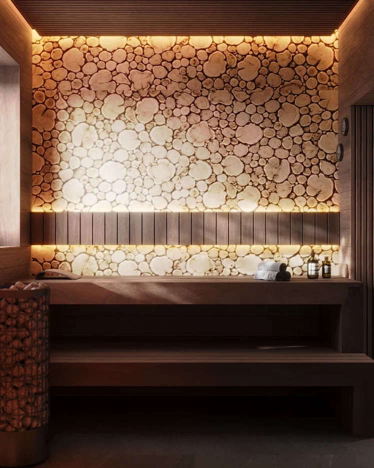 Панно из гималайской соли с подсветкой дарит сауне особую атмосферу, наполняя ее теплым оранжевым светом. Каждый спил можжевельника словно оживает, рассказывая свою уникальную историю. Мы погружаемся в мир, где время замедляется, а шум повседневной жизни отодвигается на второй план. Текстуры и оттенки материалов, играя с мягким освещением, создают ощущение уюта и гармонии. Яркие акценты во всем этом объединяют детали, добавляя жизни общему дизайну и подчеркивая великолепие натуральных материалов. Каждый элемент интерьера имеет свою мелодию, а вместе они образуют симфонию, способную отвлечь от суеты и подарить удовольствие от настоящего момента. Здесь можно забыть о заботах, наслаждаясь спокойствием и теплым светом, который окружает и вдохновляет. Позвольте себе отвлечься и погрузиться в мир спокойствия и благополучия, который создаёт этот уникальный интерьер. Который день паришься, тот день не старишься Светлое дерево в отделке сауны Дизайнерское решение: элегантная сауна с деревянной