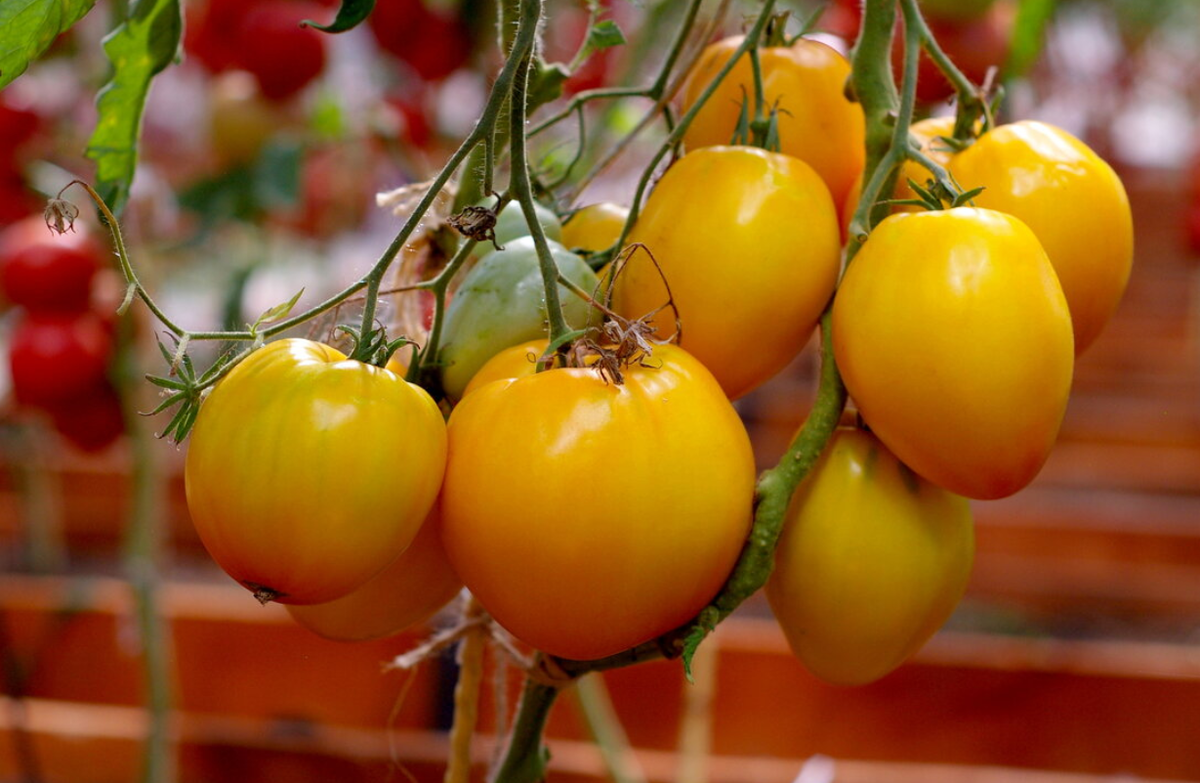 Томат желтая империя Гибрид томатов Желтая империя был разработан, а затем выведен известным российским селекционером Блокиным – Мечталиным Василием Ивановичем. Событие случилось в 2017 году, после чего были сортоиспытания. А затем, после их прохождения в 2019 году, гибрид был внесен в Российский госреестр. И там его разрешили культивировать на территории почти всей России (в 12 регионах). Томат Желтая империя имеет вегетационный период в пределах 100 дней. И это, если считать от полных всходов до первого сбора урожая. Растение индетерминантное, которое в высоту может вырасти до 2 м. Лист длинный и зеленый. Соцветие простое, и оно первое зарождается после 9 - 10 листа. Далее, соцветия образуются через каждые 3 листа. Плодоножка с сочленением. Плоды обычно получаются по 350 г. Форма сердцевидная. Окрас желтый. Ребристость средняя. Количество семенных камер может быть 6 и более. 1. Скороспелость. 2. Стрессоустойчивость. Растения легко могут пережить резкие перепады температур. 3. Высокая