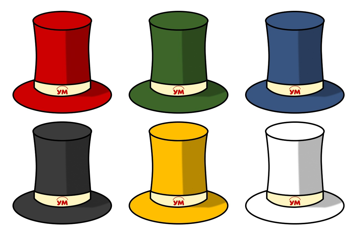 Мы привыкли смотреть на мир со своей позиции. Переключиться на точку зрения другого человека весьма сложно, да и зачем? Нам с детства внушали: “Будь самим собой, отстаивай свою точку зрения!”. Но, как доказывает наука, смотреть на проблемы с разных углов очень полезно. Это помогает всесторонне проанализировать ситуацию и принять взвешенное решение. Метод шести шляп разработал британский психолог и писатель Эдвард Боно. Он предложил для работ в группах обмен мнениями, основанный на шести человеческих типах мышления. Каждый тип обозначается цветом шляпы: При работе по методу шести шляп ученикам предлагается решать одну ситуацию, поочередно переключаясь от одного типа мышления к другому. Все ученики могут примерять разные шляпы и высказывать свою точку зрения от лица оптимиста, пессимиста, любителя фактов и т.д. Можно также разбить класс на группы, присвоив каждой из них цвет шляпы. Обсуждение всегда заканчивается на синем цвете, так как он отвечает за выводы и планы на будущее. Эта педа