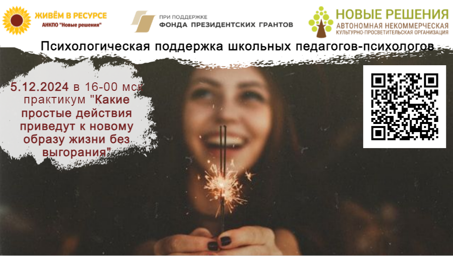Приглашаем вас на бесплатный практикум «Какие простые действия приведут к новому образу жизни без выгорания», он проходит в рамках открытого проекта «Психологическая поддержка школьных педагогов–психологов», поддержанного Фондом президентских грантов. Перед новым годом важно осознать свой текущий образ жизни: кто я, что мне важно и ценно? Какие у меня сильные и слабые стороны? Ответы на эти вопросы позволят понять, как сильные и слабые стороны своей жизни превратить в трамплин для движения в будущее, к своему новому образу жизни (к чему я иду? Что меня влечет?) На занятии мы будем определять, какие сдвиговые действия помогут каждому из нас перейти от текущего к новому образу жизни. Сдвиговые действия – это такие действия, которые: а) позволяют решить проблемы текущего образа жизни, раскрыть его потенциал и возможности; б) определяют лучи развития, на которых важно сосредоточиться, чтобы перейти к будущему образу жизни. На нашем практикуме по методу Филиппа Гузенюка речь будет идти про