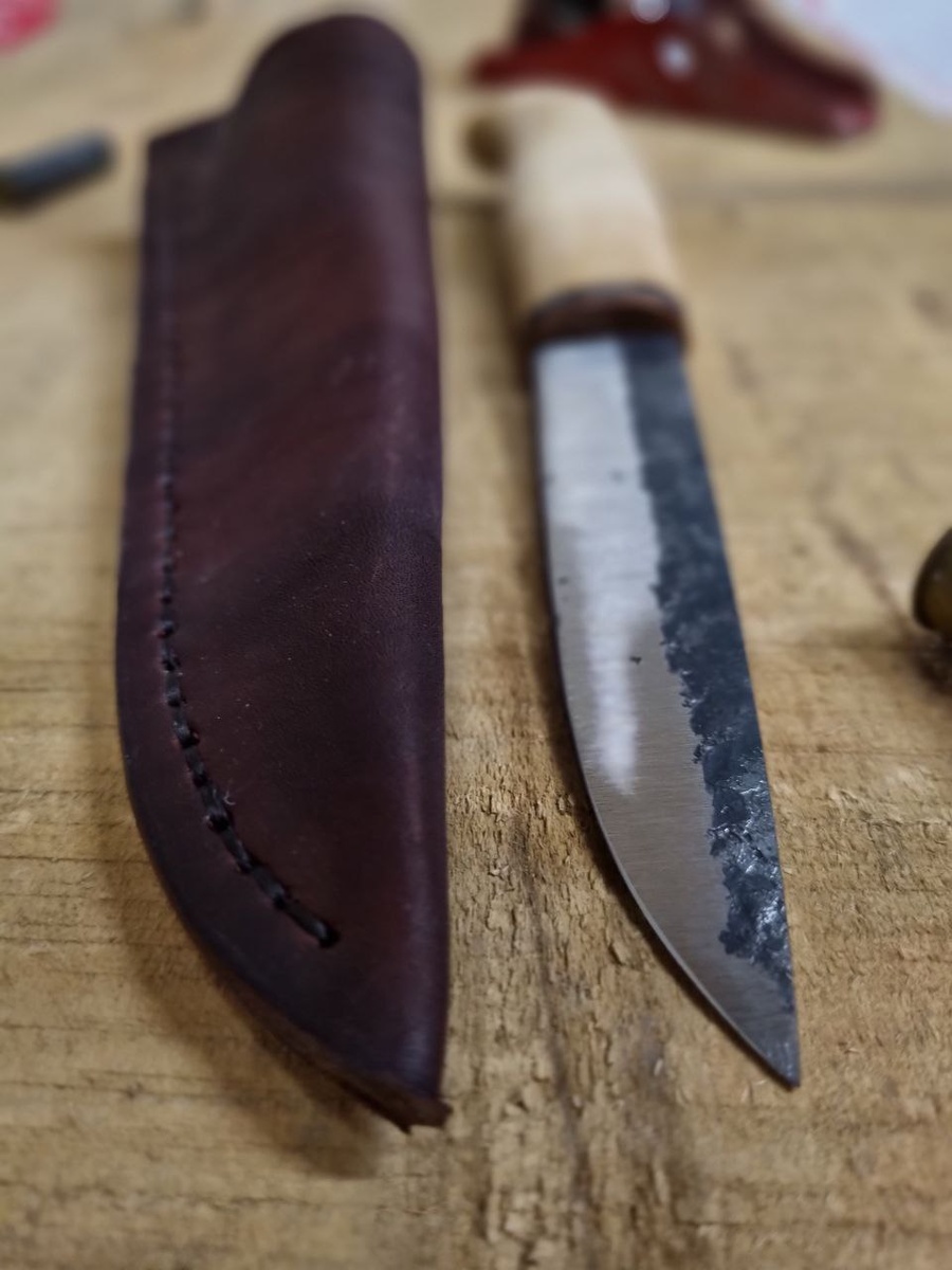 Что бывает, если итоговый результат не понравился заказчику? Ничего - нож остаётся у меня и делается новый. Никогда за это не переживал, и наверное не стану. Ни к чему, мне кажется. Нож всегда найдёт своего хозяина. Клинок кованый из ШХ15. Длинной 11см, и шириной порядка 2,5см, не сильно широкий. В обухе я его отковал на небольшой клин - от 5мм в основании до 3мм к острию. Ручку я сделал, как полагается, по-фински, бочкообразной формы, с грибом. Материал - берёзовый кап, подарок от моего хорошего друга. Украсить ручку я решил больстером с проставками из меди и чëрной кожи. Чехол, по просьбе заказчика, сделан на двух подвесах - жёстком и гибком, с медным клëпаным колечком. Пошить из рыжей кожи, т сверху покрыт маслом для влагоотталкивающих свойств.