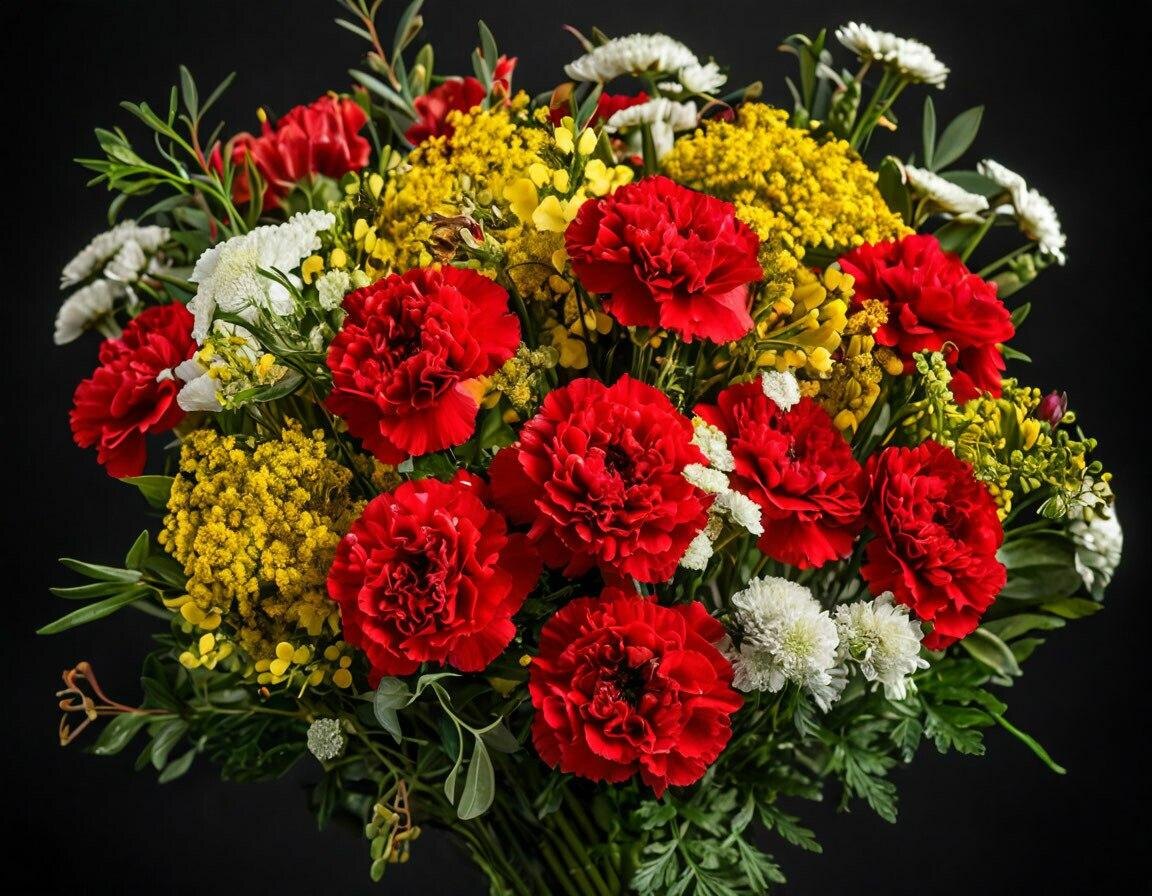 Одно из традиционных сочетаний — гвоздики с розами и хризантемами. Розы, символизирующие любовь и страсть, прекрасно сочетаются со строгой элегантностью гвоздик, создавая контраст, привлекающий внимание и вызывающий восхищение. Хризантемы с их разнообразными формами и расцветками вносят живость и насыщенность в композицию, делая её интереснее.