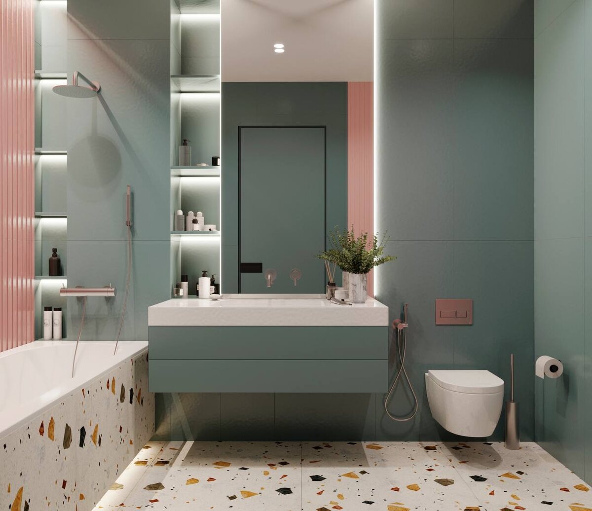 В тренде сейчас — обустройство в ванной SPA-зоны для отдыха и медитаций. Зелень в сочетании с древесными фактурами превратит её в оазис, где можно быстро восстановить силы.