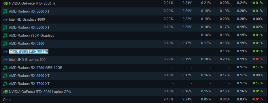 Графическое семейство Intel Arc Graphics впервые появилось в статистике Steam по аппаратному обеспечению пользователей, заметили в VideoCardz. Это именно семейство продуктов, а не отдельное решение, принадлежит к нему вся интегрированная графика процессоров Intel Core Ultra 100 (Meteor Lake) — устройства на их основе поставляются уже более года. По статистике, в октябре около 0,18% опрошенных пользователей Steam являлись владельцами устройств с процессорами Intel Core Ultra 100, в ноябре показатель увеличился на 0,01 процентного пункта. Источник изображения: Steam Учёт настольных видеокарт Intel Arc серии A (Alchemist), таких как A770 или A580, в статистике Steam ведётся по отдельности, также, как и новой интегрированной графики семейства Arc Graphics (архитектура Xe2), внутри которого предусмотрено разделение на несколько конкретных моделей. Есть вероятность, что они не будут достаточно популярны, чтобы появиться в статистике Steam. Возможно, новым настольным видеокартам Intel Arc B58