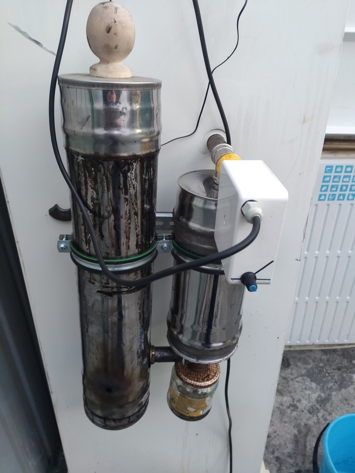 Представляю вашему вниманию, "народный" двухтрубный дымогенератор. Давайте разберемся что он из себя представляет: Слева находится бункер для щепы, его рекомендуют делать 0.5м длинной, так типо автономность больше, потому что щепы закинуть можно сразу тазик. Справа так называемый холодильник с отстойником, а отстаивать будет что, но это я потом расскажу. По задумке автора, дым под воздействием тяги образуемой куллером, он кстати в белой коробочке на правой трубе, будет проходить из левого бункера в правый, там будет охлаждаться до температуры окружающей среды, вся грязь, смолы, сажа и т.д будет конденсироваться на его стенках и стекать в отстойник, а дым чистый и полезный (НЕТ) будет попадать в камеру и коптить наш продукт. И вроде бы в теории все сладко, но в процессе эксплуатации вылезли некоторые нюансы: 1. Зависание щепы, после некоторого времени работы, щепа склеивалась от образовавшихся во время тления смол и прилипала к стенкам камеры, мешая осыпаться вслед уже прогоревшей щепы, из-за этого приходилось время от времени стучать по бункеру. 2. Смолы, они были везде, в бункере с щепой, в отстойнике, на крышке бункера, во всех соединительных трубках, так что их приходилось чистить через 1-2 копчения. 3. Влажность, все таки хотя правый бункер и предназначен конденсировать влагу и охлаждать дым, но справлялся он с этой задачей крайне плохо, как итог это конденсат по всем стенкам камеры, хорошо хоть на продукте его не было. 4. Детонация, не частое явление, но неприятное, в бункере с щепой иногда скапливались газы и когда щепы оставалось мало, детонировали, иногда просто хлопок, а иногда и крышка подлетала. Полез опять я на ту платформу, но почему так происходит и что с этим делать информации я не нашел. Нет, были конечно предложения врезать в магистраль еще 2-3 банки, пустить дым под землей для лучшего охлаждения и т.д, но никто не мог назвать мне причину возникновения этих проблем и способ их устранения, хотя проблемы эти озвучивались многими. Ну раз великие гуру коптильных дел помочь не могут, пошел сам искать свой путь. Следующая модель моего дымогенератора выглядела так: