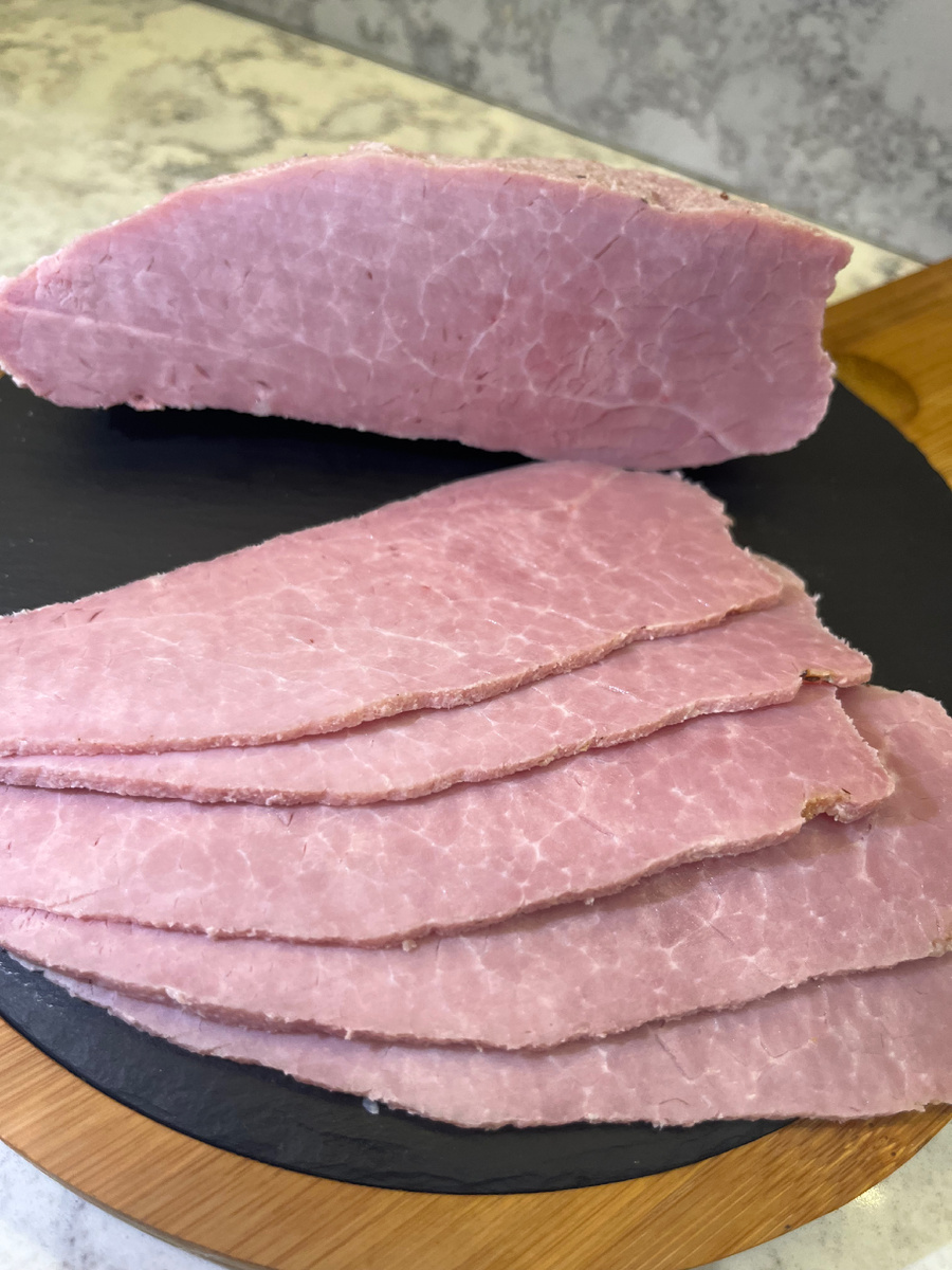 Домашний ветчинный окорок отлично подходит на роль замены покупной колбасы. Бутерброд с таким мясом понравится Вашим домашним и друзьям, а нарезка украсит праздничный стол. Приготовить такой продукт самостоятельно не займёт много сил и времени, а результат Вас приятно удивит! Рецепт: Ингредиенты: Окорок обсыпьте солью и упакуйте в вакуумный пакет. Отправьте окорок в холодильник на посол в течении 10 дней. После посола следует провести термообработку в духовом шкафу или сварить в воде с помощью терморегулятора по технологии су-вид, т.е. в вакуумной упаковке. Если готовите окорок в духовом шкафу , то следует извлечь окорок из упаковки, где мясо солилось. Поместите окорок в духовку при температуре 30-40 градусов на 30 мин. Температура внутри куска мяса по истечению этого времени будет 25-30 градусов, а окорок приобретет гладкую глянцевую поверхность приятного розового цвета. Дальше выставляем в духовом шкафу температуру 75-80 градусов, на дно духовки помещаем емкость с кипятком (про