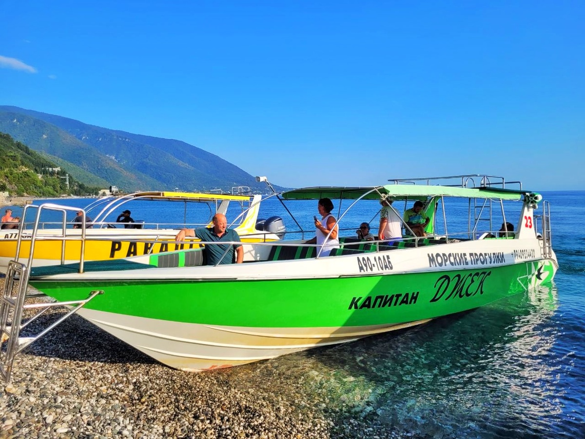 Отдыхая этой осенью в Гагре, я точно знала, что хочу побывать на морской прогулке, посмотреть на побережье главного курорта Абхазии с воды. Вначале думала заказать экскурсию заранее через интернет, как обычно и делаю. Но, лежа на пляже, я поняла, что лучше не брать кота в мешке. Мимо меня проходили то огромные и очень медлительные теплоходы, полностью набитые туристами, то скоростные современные катера и катамараны, как я люблю. К тому же полупустые. Цена у всех была одна и та же - 1500 руб с человека за прогулку. При заказе морской экскурсии через интернет стоимость была идентичной. Практически со всех катеров и теплоходов, проплывавших меня мимо несколько раз в час, по громкоговорителю объявляли, что сейчас начинается морская экскурсия к Белым скалам, на борту есть свободные места. Если есть желающие присоединиться - помашите рукой. Судно подплывет к берегу и вас заберет. Изо всех этих плавсредств мне больше всего понравился скоростной катер "Капитан Джек". Современное судно, которое