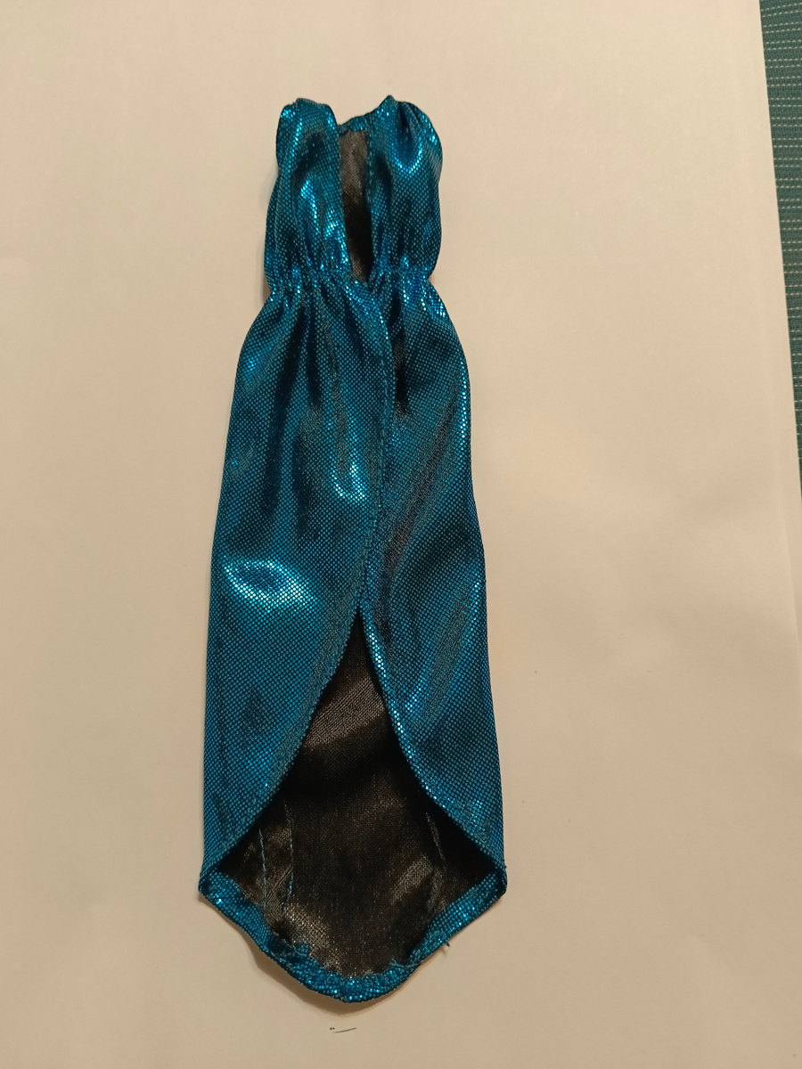 Многие уже покупали такие платья для своих куколок в Карри Кидз. У меня есть синее и розовое. Сразу скажу: платья красивые, но есть проблема. На кукольной фотосесии постоянно нужно поправлять такие платья, ибо из-за сборки на резинке платье открывает излишний обзор, особенно если куколку фотографирую сидя. (Другими словами - просто разъезжается и кукла "светит" молдированным бельём). В общем не самая любимая вещь в кукольном гардеробе. Я решила сшить похожее платье, взяв за основу платье из КК, со своими корректировками, конечно))) Форма у платья интересная, эллипс. Вот такая выкройка получилась. Все без разметки и припусков на швы, приложила готовое платье, наметила контуры эллипса, наметила прорези для рук и вырезала. Чистый эксперимент. Ткань у меня не "сыплется", ну если что - есть жидкость для обработки среза. Ткань называлась - трикотаж "мунлайт" с люрексом. По толщине - примерно как тонкая кулирка (это из которой футболки шьют). В общем вырезала эллипс, сделала прорези для ру