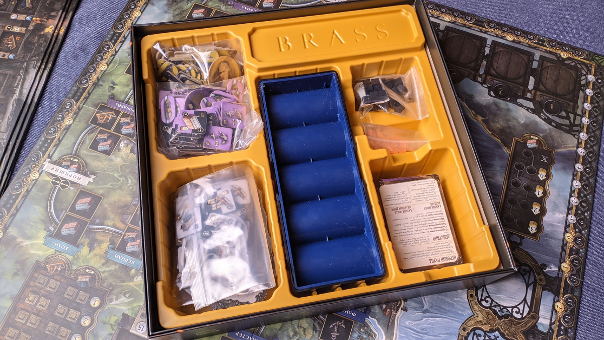 Мне не доводилось бывать в фирменных магазинах «Crowd Games» (к слову, коробочку на обзор прислали именно они. Обнимаю), но почти уверен, что «Ланкашир» (если стоит на видном месте) сразу же приковывает внимание к себе. Эти краски тёмных оттенков (у нас тут промышленная революция 18-19 веков, как-никак. Небеса, полные копоти сжигаемого угля, железные дороги и паровые машины), эта тиснённая золотом надпись «Brass. Ланкашир»... Итак!