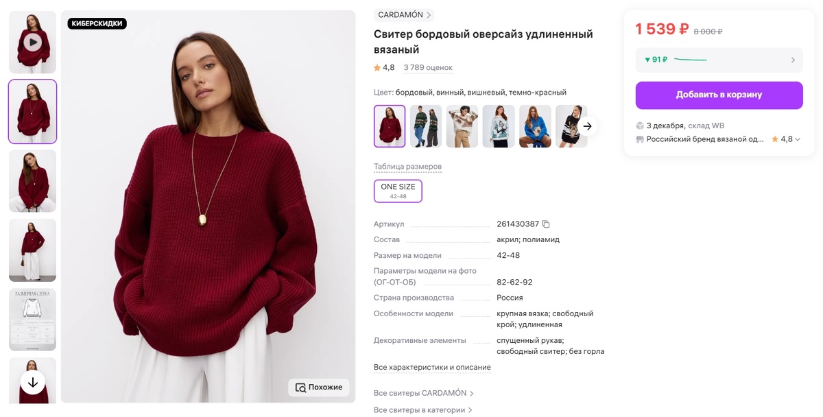 Привет дорогие читатели👋 Сегодня мы с вами будем обозревать тёплые вещи на зиму, так что, если вы ещё не обновили гардероб моя статья подкинет вам новые идеи. Приятного просмотра😊 Открывает нашу подборку красивый вязаный свитер сочного бордового цвета. Длинный рукав, свободный крой отлично подойдёт как для повседневной носки так и для деловых образов. Мягкая пряжа, приятный на ощупь, можно носить как осенью так и в зимние вечера Артикул: 261430387 Ещё один свитер в нашей подборке, много свитеров не бывает😁 Крупная английская вязка свободный крой подойдёт к любому гардеробу. Артикул: 51176890 Популярная модель 2024 года, зауженные в клетку. Брюки тёплые со средней посадкой, очень удобно носятся. Плотная в тоже время мягкая и приятная на ощупь ткань по типу кашемира. Артикул: 49246682 Классические брюки утеплённые с широкой резинкой на поясе подчеркнут вашу талию. Трикотажная плотная, приятная к телу ткань не скатывается, не деформируется и не линяет. Брюки классические подходят для н