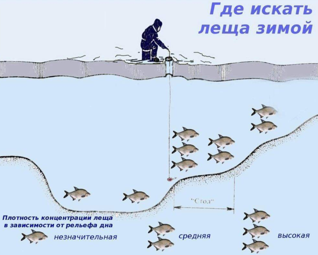 На Поливах. На ряде водоемов определенные стаи леща и подлещика выбирают кормные поливы для постоянного обитания. Если рыболовы из года в год ловят леща в одних и тех же местах, лещ быстро привыкает к регулярной прикормке и постоянно навещает подобные участки. Как уже упоминалось ранее, леща и подлещика привлекают изрытые поливы, в которых он когда-то находил залежи природного корма (мотыль, личинки, мелкие рачки). Например, на Яузском водохранилище, в районе деревни Савино, за островами лещ зимует в поливах на протяжении всей зимы, начиная с самого начала ледостава и до таяния льда. Рыболовы здесь редко остаются без улова. Важно в таком случае на относительно ровном дне с глубинами 5,5-6 м найти зону, где начинается понижение до 6,5-7 м. Это понижение может проявляться в виде обширной ямки или длинной канавки. Наличие отдельных коряжин в поливе всегда приносит позитивный результат ловли, так как в таких точках часто кормятся стаи разнообразной белой рыбы. Часто к улову подлещика добавляются неплохие экземпляры плотвы.