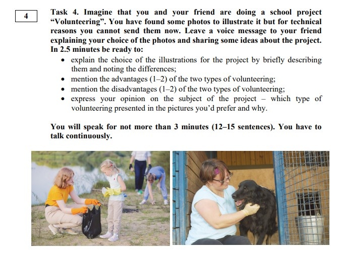 Задание 4 на устной части ЕГЭ по английскому языку — это проектная работа, в которой вам нужно описать две фотографии, сравнить их, выделить преимущества и недостатки каждого варианта, а затем выразить своё мнение и обосновать его. Несмотря на кажущуюся сложность, можно с лёгкостью подготовиться и уверенно справиться с этим заданием, если знать, как правильно подойти к его выполнению. Попробуем выполнить задание из демоверсии ЕГЭ 2025 Тема: Volunteering (Волонтёрство) ""Hello, I’ve chosen two photos for our project on volunteering, and I want to describe them and share my opinion." "The first photo shows a group of young people cleaning a park. They are picking up litter and holding trash bags. This is an example of environmental volunteering." "The second photo shows a woman in an animal shelter. She is sitting next to a dog and taking care of it. This photo represents volunteering to help animals." "Both activities are very important. As for cleaning parks I can say that it helps t