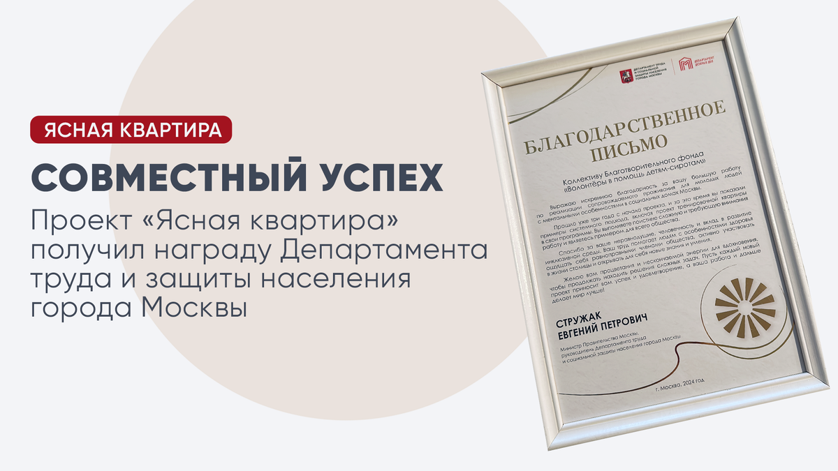 29 ноября наш фонд получил награду Департамента труда и защиты населения города Москвы «Совместный успех» за реализацию проекта сопровождаемого проживания молодых взрослых с ментальными особенностями «Ясная квартира». Днем раньше координатор проекта Биргит фон Озен выступила на II Межрегиональной НеКонференции «Живут же люди», посвященной развитию инклюзивных практик и технологий. Она рассказала о возможностях, которые открываются студентам «Ясной квартиры», и о их личных победах.