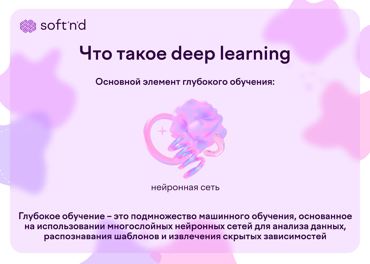 Deep learning На протяжении последних десятилетий в области искусственного интеллекта наблюдается заметный рост интереса к методам глубокого обучения (deep learning). Глубокое обучение – это подмножество машинного обучения, основанное на использовании многослойных нейронных сетей для анализа данных, распознавания шаблонов и извлечения скрытых зависимостей. Что такое deep learning Глубокое обучение представляет собой революционный подход к обработке данных и выполнению сложных вычислительных задач. В отличие от традиционных алгоритмов машинного обучения, которые полагаются на предварительно сформулированные правила и фичи, deep learning использует многослойные искусственные нейронные сети. Эти сети, вдохновленные структурой человеческого мозга, могут обучаться на огромных объемах данных и осуществлять автоматическое извлечение признаков. Основной элемент глубокого обучения – это нейронная сеть, состоящая из входного слоя, нескольких скрытых слоев и выходного слоя. Каждый нейрон в сети о