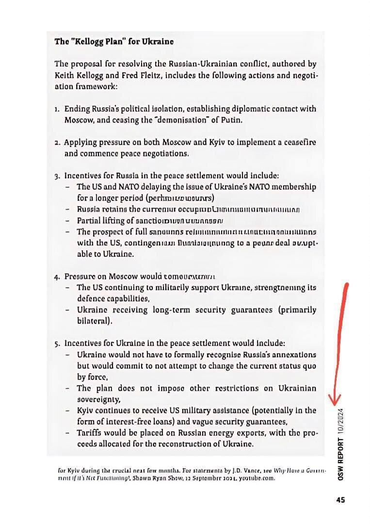 Что предлагают: ▪️Прекращение изоляции России ▪️Мирные переговоры Оказать давление на Москву и Киев, чтобы они договорились о прекращении огня и начали переговоры ▪️Стимулы для России Отложить членство Украины в НАТО на 10 лет Позволить России сохранить удерживаемые территории. Постепенная отмена санкций и нормализация отношений с США при условии заключения мирных соглашений, приемлемых для Украины ▪️Поддержка Украины Продолжение военной помощи и двусторонних гарантий безопасности. Украине не нужно официально признавать контроль РФ, но она должна воздержаться от изменения статус-кво силой. ▪️Давление на Киев Потенциально прекратить военную помощь США, если Украина откажется от мирных переговоров