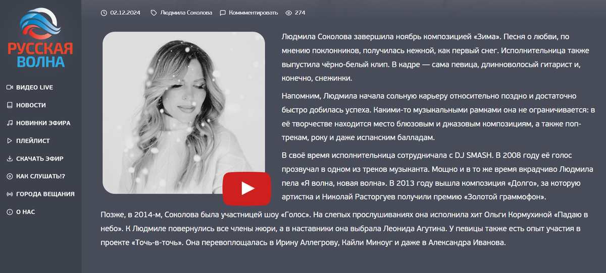 Людмила Соколова завершила ноябрь композицией «Зима». Песня о любви, по мнению поклонников, получилась нежной, как первый снег. Исполнительница также выпустила чёрно-белый клип. В кадре — сама певица, длинноволосый гитарист и, конечно, снежинки. Больше подробностей на сайте радиостанции РУССКАЯ ВОЛНА