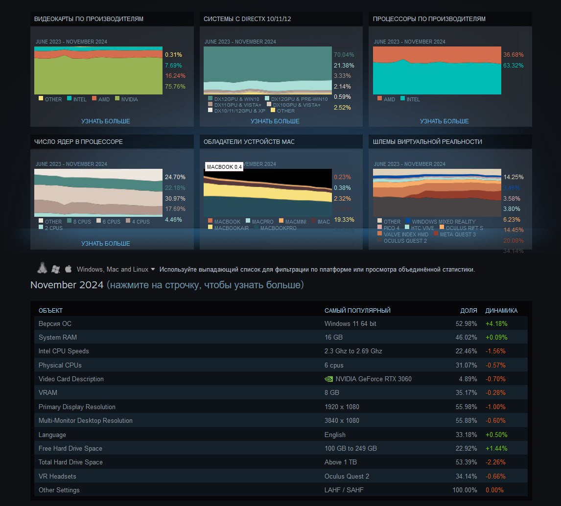 Valve опубликовала статистику Steam за ноябрь 2024 года, показав изменения в предпочтениях геймеров