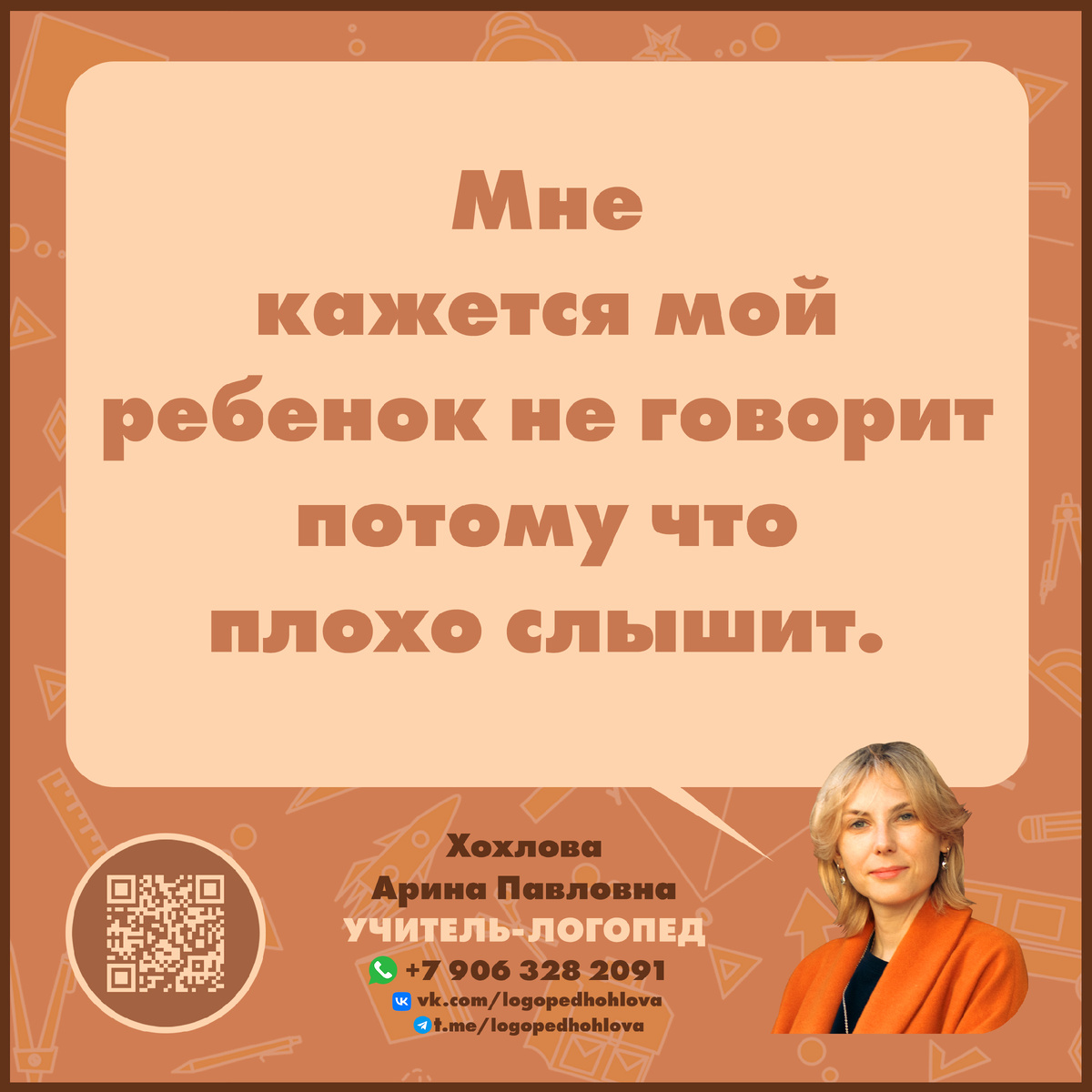 МОЙ РЕБЕНОК НЕ ГОВОРИТ, ПОТОМУ ЧТО ПЛОХО СЛЫШИТ 🔸Здравствуйте! На связи учитель-логопед Хохлова Арина Павловна. Сегодня предлагаю затронуть тему слуха у детей. 🔸Речь тесно связана с получением и обработкой информации через разные наши органы: зрение, слух, осязание и вкус. Для развития речи большое значение имеет слух. Так как ребенок слушает и слышит разные интонации, тон, модуляции. Все это потом он применяет в своей речи. Затем он на слух учится повторять за взрослым слова и предложения. А в дальнейшем слух ему поможет в написании диктантов в школе. Но речь не может развиваться, если нет слуха. Именно поэтому речь слабослышащих и глухих людей отличается от речи обычного человека. Как выявить, что у ребенка снижен слух? 🔸В три месяца он не реагирует на очень громкие звуки, не поворачивает голову в сторону шума, не пугается громкого и резкого звука. 🔸К 9-ти месяцам ребенок должен откликаться на свое имя и реагировать на него. 🔸После года можно попробовать позвать ребенка шепотом,