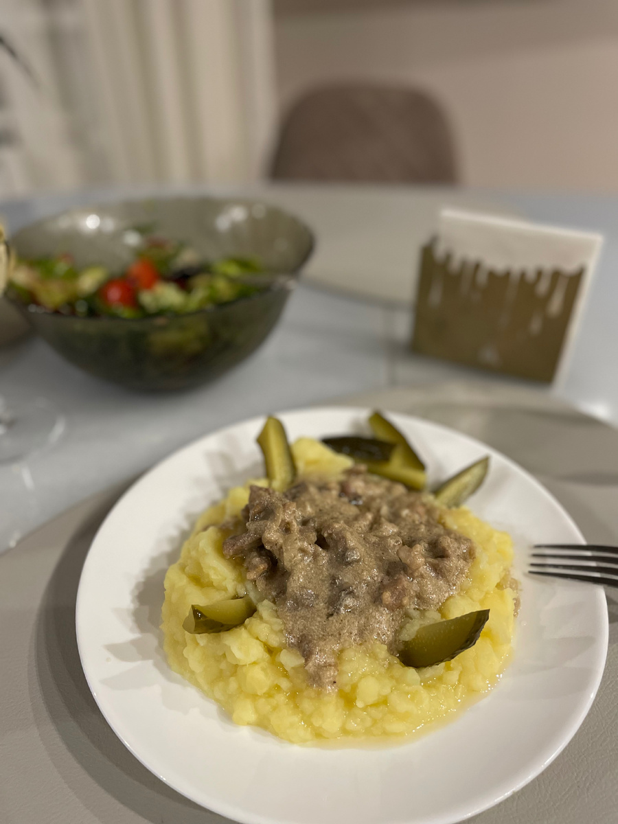 Сочетание нежной говядины, ароматных шампиньонов и сливочного соуса создаёт невероятно вкусное и сытное блюдо. Подайте его с воздушным картофельным пюре — и ваш ужин станет маленьким кулинарным праздником! Для бефстроганова: Для картофельного пюре: Шаг 1: Подготовка ингредиентов Шаг 2: Обжарка мяса и шампиньонов Шаг 3: Обжарка лука и приготовление соуса Шаг 4: Приготовление пюре Шаг 5: Подача Для особого аромата добавьте в соус щепотку мускатного ореха или немного свежемолотого кориандра. А шампиньоны можно заменить на белые грибы или вешенки для более насыщенного вкуса. Приятного аппетита! ☀️