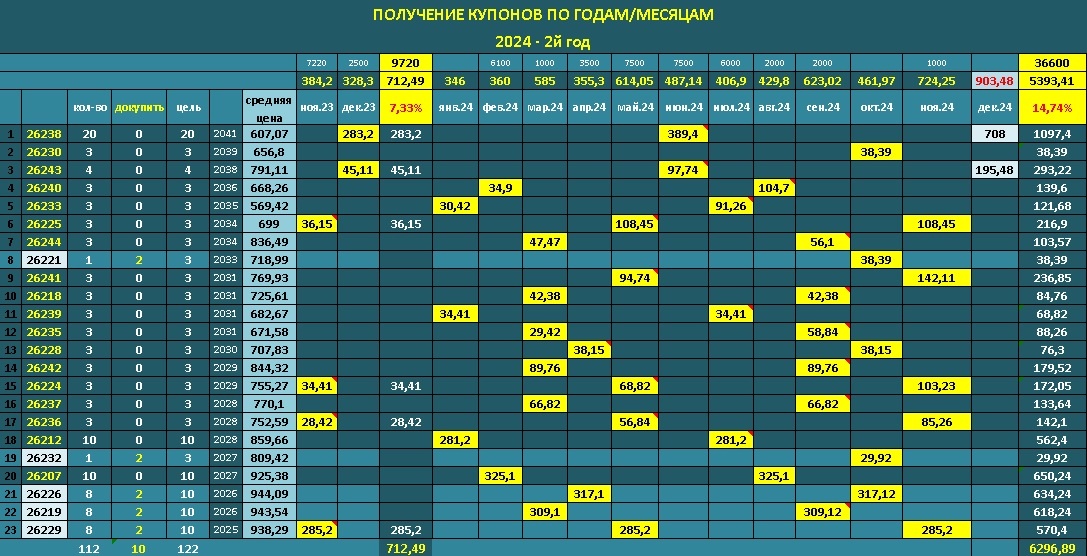 Облигационный портфель На 02.12.24 в портфеле 78504,86 руб (-11760,5 руб, - 13,02%) 13.11.24 получены купоны по ОФЗ 26229 - 285,20 руб 20.11.24 получены купоны по ОФЗ 26236 - 85,26 руб получены купоны по ОФЗ 26225 - 108,45 руб 27.11.24 получены купоны по ОФЗ 26224 - 103,23 руб получены купоны по ОФЗ 26241 - 142,11 руб Итого: все купоны на сумму 724,25 руб Куплены по плану ОФЗ: ОФЗ 26224 - 1шт по цене 669,98 руб. Средняя цена стала 755,23 руб ОФЗ 26241 - 1шт по цене 688,2 руб. Средняя цена стала 769,93 руб. ОФЗ 26236 - 1шт по цене 680,1 руб. Средняя цена стала 752,59 руб. ОФЗ 26244 - 2 шт по цене 774,5 руб. Средняя цена стала 836,48 руб. ОФЗ 26228 - 2шт по цене 672,00 руб. Средняя цена стала 707,83 руб. ОФЗ 26218 - 2шт по цене 669,41 руб. Средняя цена стала 725,61 руб. ОФЗ 26230 - 2шт по цене 540,97 руб. Средняя цена стала 579,58 руб. В декабре по плану надо докупить 10 облигаций - по 2 шт каждой (26221, 26232, 26226, 26219, 26229). А также придут купоны по двум облигациям на сумму 903,