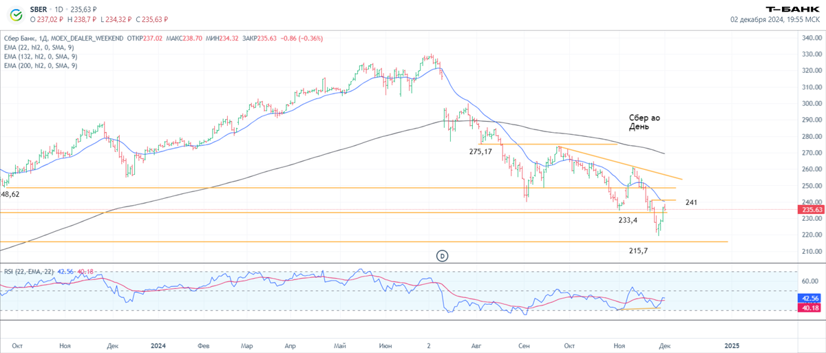 Дневной график: С июля 2024 котировки находятся в нисходящем тренде. Постдивидендный гэп усилил это движение. За неделю 25-29 ноября цена вывалилась вниз из обозначенного ранее боковика с границами 233 / 240 – 275 и почти сходила до уровня 215, но игроки на повышение перехватили инициативу и вернули цену выше уровня 233. Формально нисходящий тренд продолжается – минимумы и максимумы снижаются, как и средняя ЕМА-22. Но резкий разворот котировок дает надежду на окончание снижения и переход в боковик. Сверху движение ограничено уровнями 240 и динамической ЕМА-22, снизу – минимумом от 27 ноября и отметкой 215, которая тянется еще с мая 2023. RSI нарисовал плоскую дивергенцию с ценой, хотя предыдущий минимум не опустился ниже уровня перепроданности. Технические факторы за рост: резкий откуп цены и возврат выше уровня 233, закрытие бара на максимумах, дивергенция RSI; Для продолжения роста необходимо выходить выше ЕМА-22 и уровня 240. Технические факторы за снижение: нисходящий тренд в силе