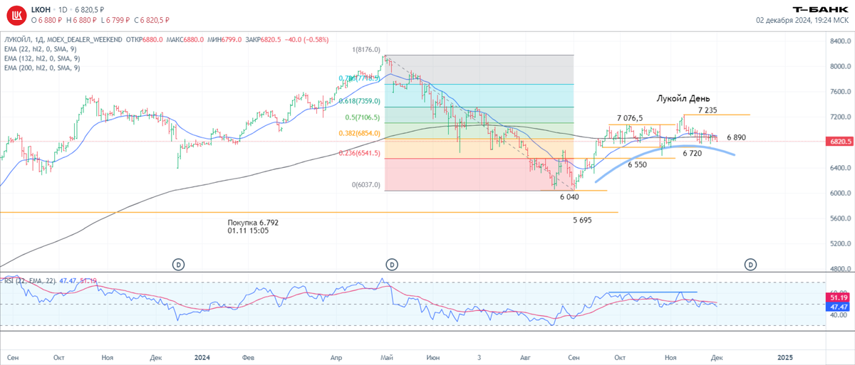 Дневной график В прошлом обзоре мы выделяли бумагу в качестве такого особнячка, который в отличие от широкого рынка «держал линию» - котировки находились выше обеих средних, демонстрируя движение в канале как раз «по линиям средних». Волна коррекционного роста к предыдущему снижению от вершин конца апреля почти дошла по ФИБО до 61,8 %, после чего развернулась и выше пока не идет. Даже предыдущую неделю 25-29 ноября цена демонстрировала нейтральную реакцию на общее поведение рынка, но сегодня начинает заваливаться в сторону нижней границы канала. Средняя ЕМА-22 начинает закругляться вниз. Средняя ЕМА-200 движется горизонтально. «Площадка» из двух скользящих не удержана. RSI из нейтральной позиции повернулся в сторону снижения – линия находится ниже своей средней и ниже нейтральной 50, при этом и линия индикатора и его средняя смотрят вниз. Технические факторы за рост: возможно появятся около поддержки 6.720 Для подтверждения ростовой картины нужно закрепляться выше ЕМА-22 /ЕМА-200 и дви