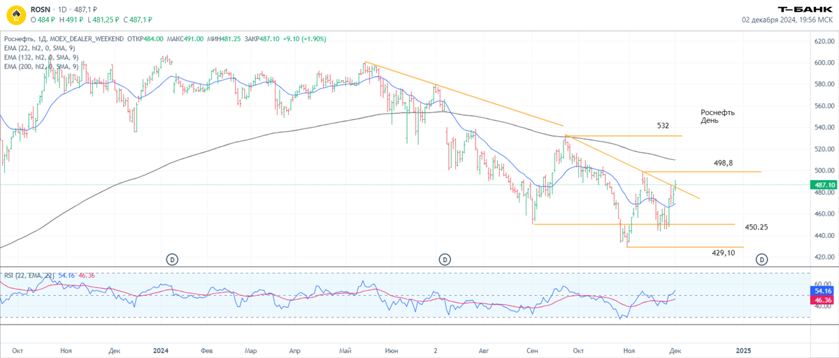 Дневной график Как и широкий рынок, акции находятся в нисходящем тренде с мая 2024. Боковик в границах 530 – 607, который постепенно сужался и снижался в итоге был пройден вниз, ниже ЕМА-200 / ЕМА-22, где цены продолжили коррекцию, но под чуть более крутым углом, однако, не преставая делать попытки выйти в рост. Неделю 25-29 ноября цена курсировала между ЕМА-22 и уровнем 450, периодически ныряя под него. По итогу недели цена умела преодолеть указанную отметку вверх и остановилась как раз между средней и обозначенным уровнем. Формально нисходящий тренд продолжается – минимумы и максимумы снижаются, но образовавшийся локальный минимум в области 450 на прошлой неделе, не доходя до предыдущего минимума 430 и поход от него вверх, вселяет надежду на формирование полноценного боковика. Средняя ЕМА-22 начинает двигаться горизонтально, подтверждая формирование коридора. Для подтверждения картины нужно закрепляться выше предыдущего максимума 498 (500), а так и до водораздела ЕМА-200 будет рукой