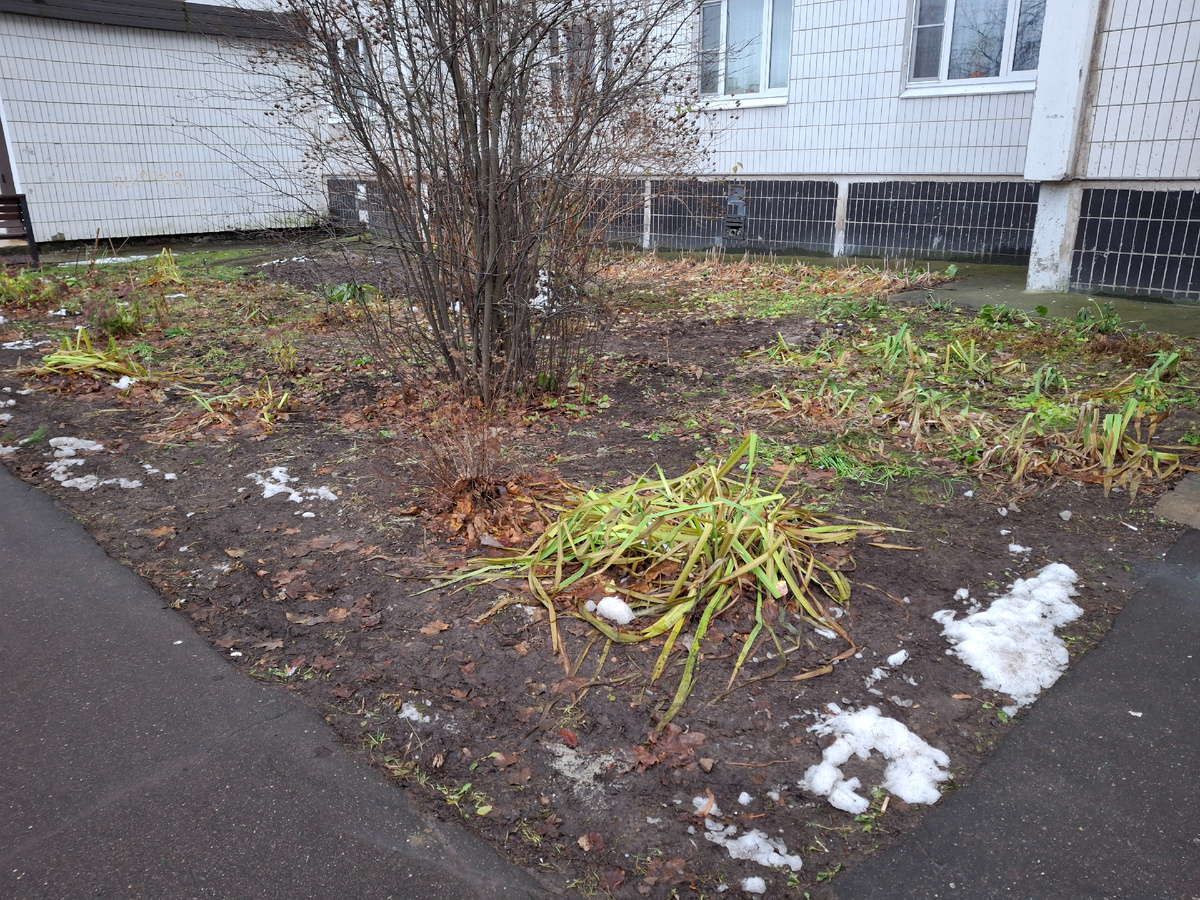 Снег на клумбе растаял. Хотела вчера обрезать сухое, но световой день такой короткий, что пока возилась на кухне, стало темно. В 16 часов уже включают фонари.