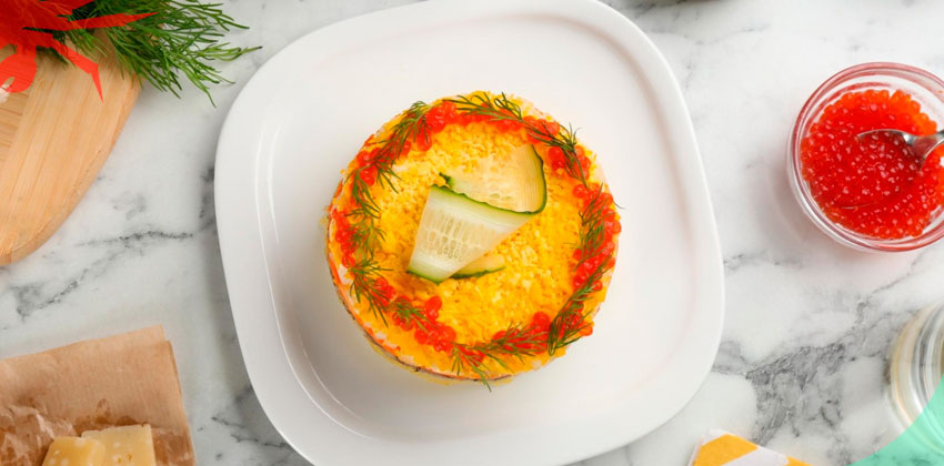 Ингредиенты: Для начала отвариваем картофель и морковь за 20–25 минут, а яйца — вкрутую за 10 минут.Даем остыть и очищаем. Разделяем яйца на белки и желтки. Натираем их по отдельности. Также натираем картофель, морковь, сырки и, при желании, добавляем огурец. Рыбу нарезаем маленькими кусочками. Выкладываем слоями картофель, рыбу, огурец, морковь, сырки и белок. Слои присаливаем, перчим и промазываем майонезом. Покрываем салат сверху желтком. Украшаем икрой и зеленью. Убираем в холодильник на 1 час. Источник: https://wildcrab.ru/news?id=2605