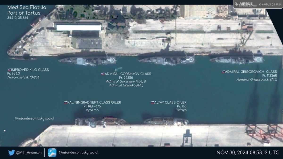 Европа 30 ноября сфотографировала из космоса базу ВМФ в Тартусе, работал спутник производства корпорации Аэрбас. Корабли на месте: два фрегата типа "Адмирал Горшков", сам головной корабль серии, а также однотипный "Адмирал Головко", оба пришли с Северного флота. Так же на базе фрегат "Адмирал Григорович" проекта 11356(головной в своем типе), плюс подводная лодка "Новороссийск" проекта 636М «очень черная дыра». Плюс в базе два танкера обеспечения. База тесная, корабли стоят рядом, достаточно опасно. Надеюсь, что никакие беспилотники туда не прилетят, морские дроны не приплывут. Стоит отметить, что качество снимка довольно таки слабое, не особо лучше Ресурса-П, до США, Израиля и Китая им далеко в этом плане. Хотя последние Европейские спутники имеют качество лучше, но и цена там от сотни-другой миллионов долларов за единицу. Можно долго рассуждать о том, зачем России столько кораблей в особо опасной Сирии. Было бы умнее в свое время обосноваться в Ливии, там подбрюшье Европы, да и мно