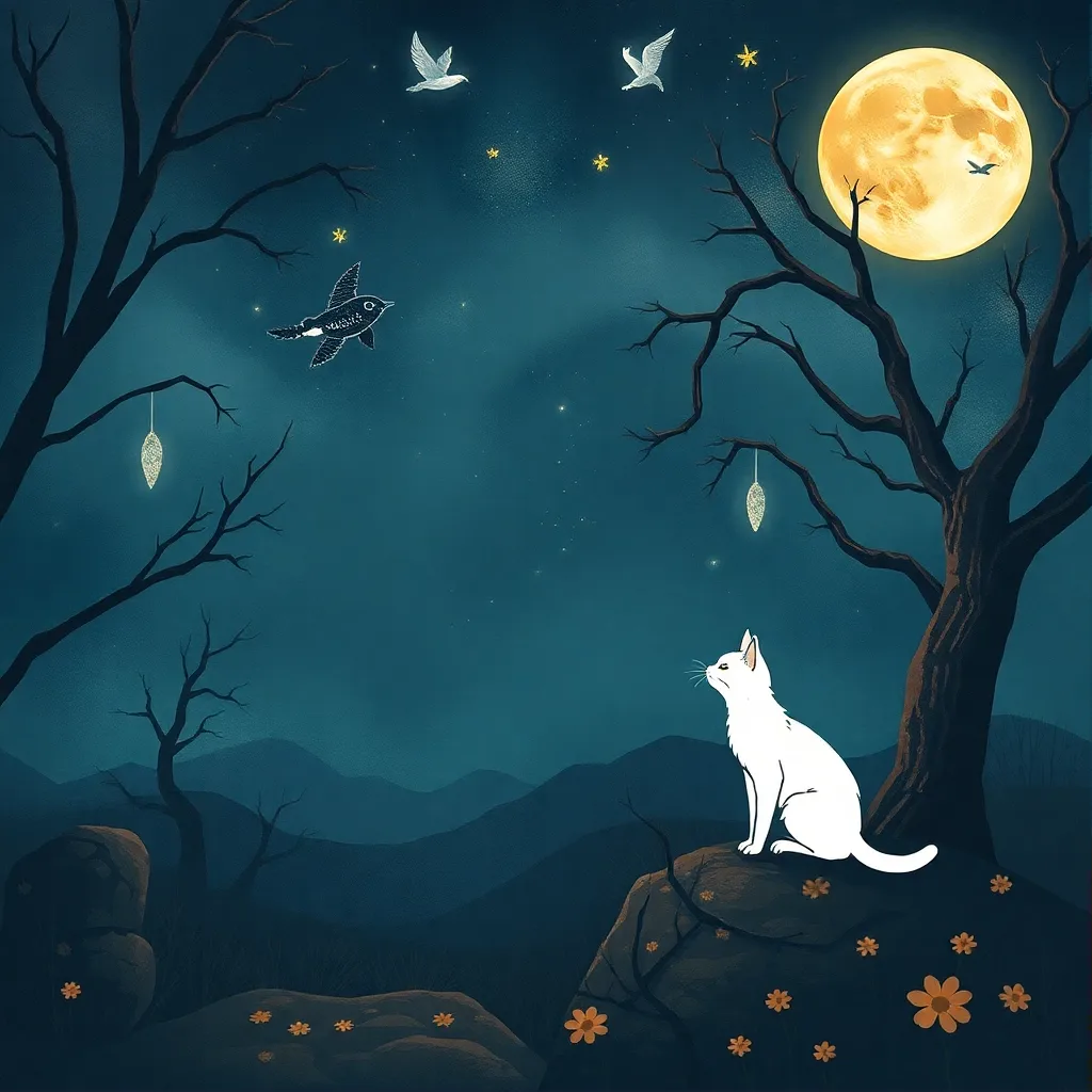 В одной далекой стране, где звезды пели тихие колыбельные, а луна серебрила ночные поля, жил необычный кот по имени Лунный Кот. У него была шерсть цвета луны, и глаза мерцали так, будто в них отражалось ночное небо. Каждую ночь Лунный Кот выходил на прогулку, чтобы услышать разговор звезд. Однажды, бродя по светлой лунной дорожке, он услышал тихий плач. Недолго думая, Лунный Кот направился на звук и встретил маленькую звездочку по имени Люция. Люция упала с неба и не могла найти дорогу домой. Лунный Кот улыбнулся и сказал: "Не плачь, маленькая звезда. Я помогу тебе вернуться на небо." Звездочка перестала плакать и доверилась мудрому Коту. Они вместе отправились в путь к высокой горе, с вершины которой открывался вид на бескрайнее ночное небо. На вершине горы Лунный Кот попросил сову Хедвигу, старую подругу, помочь им. Хедвига была не только мудрая, но и отлично летала. Она согласилась и пообещала помочь маленькой звездочке взлететь в небо. Как только луна выглянула из-за облаков, сова