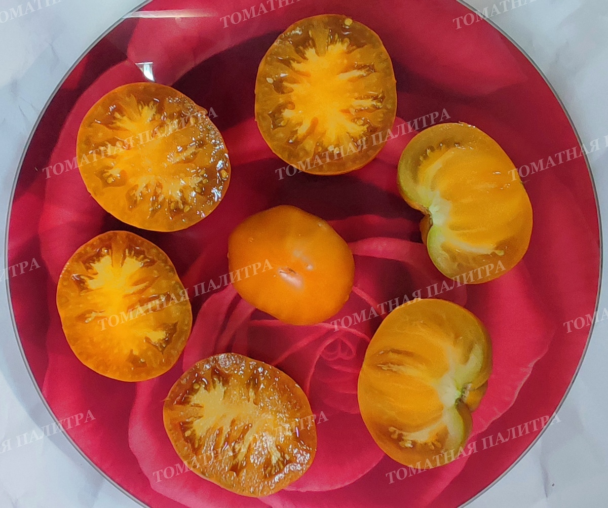 На такого цвета сорта у меня сразу появляется «охотничья стойка» Потому что, на мой вкус, это самые сладкие томаты наряду с зелеными! Но если зеленоплодные сорта еще пока вдохновляют не всех, то помидоры цвета «охры» вызывают аппетит при одном взгляде на них. С томатом ЯРСОН 17 я точно не прогадала… Вы только посмотрите на эту роскошь! Все крупные – в среднем от 200 до 400 грамм. У меня вырастали и крупнее без особого на то труда. Эдакие красавцы бифы и мячики! С пухлыми бочками цвета не ординарного, не привычного – горчично-желто-охристого с блестящим бронзовым отливом и болотно-зелеными плечиками… Глаз не оторвать от такой красоты неземной! А как разрежешь – таааааам…… эта нежнейшая мякоть с текстурой спелого киви…. Ведь даже обычное фото без труда передает, как этот мармеладный гель дрожжит, словно незастывшее желе… Тут и убеждать никого не надо, что все это просто тает во рту, расплавляясь сладчайшим соком… Вкус фантастический! Медово-сахарный сироп, приправленный тонкой ноткой тро
