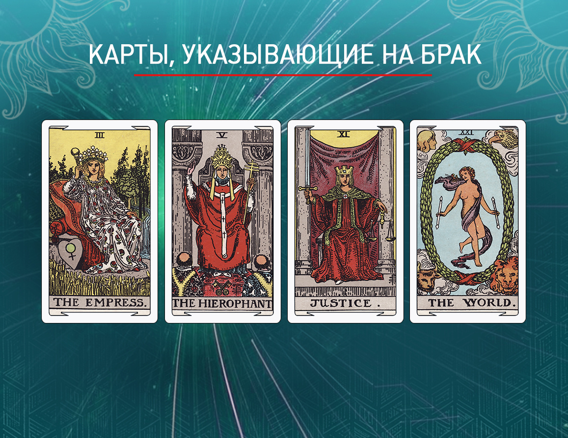 Да, карты в раскладах дают огромное количество комбинаций, которые могут указывать на брак. Но в этом посте мы рассмотрим основные из них, которые в подтверждающей комбинации (и конечно – контексте вопроса) наиболее явно могут указать на брак. Императрица Традиционно – карта семейной женщины, которую любят и ценят. Карта указывает на семью, семейное благополучие, когда «дом – полная чаша». НО – внимательнее: эта же карта, в том числе в прямом положении, может указать также на любимую, значимую женщину – любовницу, в которую вкладываются – ресурсами, вниманием. Также в раскладах эта карта может указать на то, что у мужчины УЖЕ есть семья. Иерофант Карта традиционных ценностей. В контексте вопросов на отношения показывает серьезные намерения, зрелые чувства партнёров, готовность к созданию семьи. Справедливость Карта показывает вопросы, связанные с оформлением официальных бумаг, судебными делами. Это также может быть как заключение, так и расторжение брака. Мир Карта перехода на новый ур