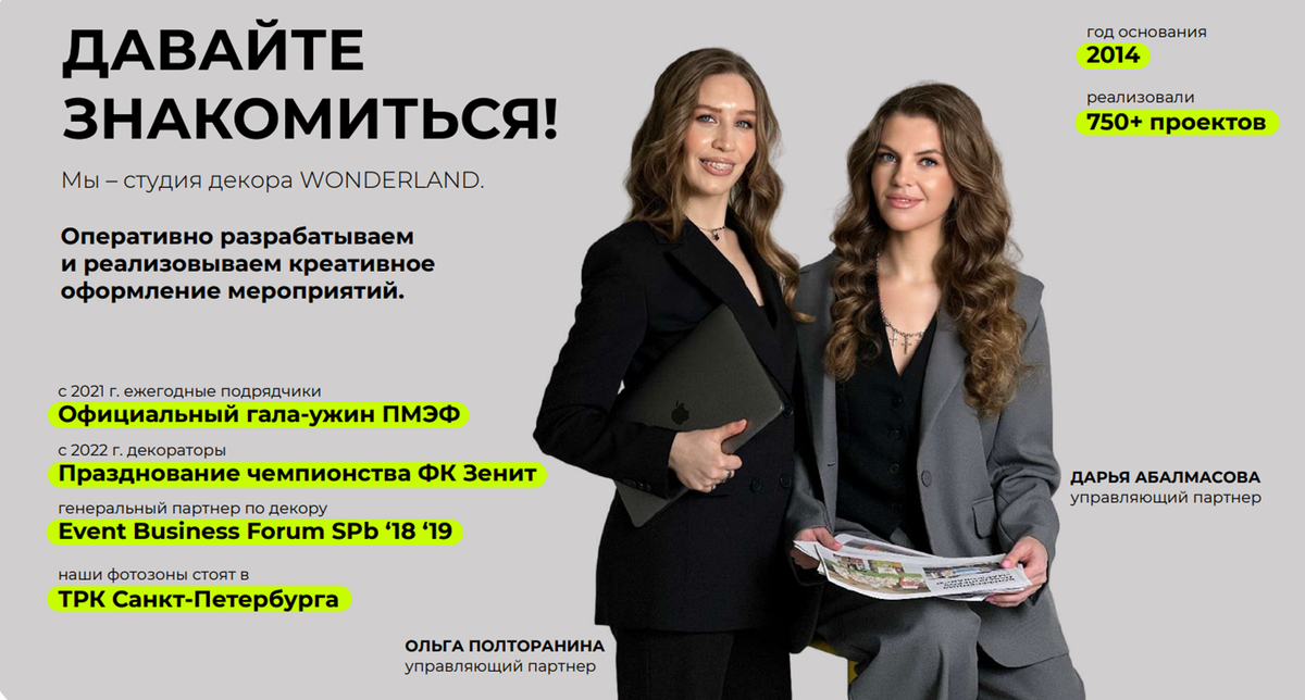 Для всех, кто впервые оказался в нашем канале — разрешите представиться. Мы студия декора Wonderland. В 2024 году мы вошли в ТОП-3 Лучших дизайн-бюро РФ. Уже 10 лет мы оформляем пространства для деловых и корпоративных мероприятий, фестивалей, торговых центров и частных праздников. За нашими спинами 150+ клиентов и столько созданной красоты, что мы не знаем, какими из кейсов поделиться здесь — их и правда много. Прикрепим лишь несколько, а за остальными проектами и контактами для связи спешите в наш телеграмм-канал! Кстати, полную презентацию студии мы оставили там же, в закрепленном посте. А еще за нашей студией можно следить в других соцсетях: ВК Нельзяграм Pinterest _______________________________