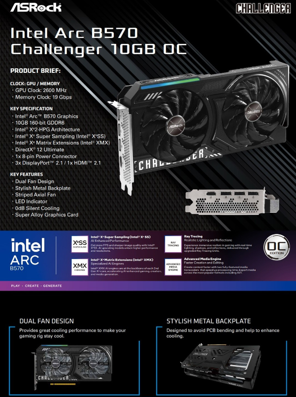 Две предстоящие дискретные видеокарты Intel поколения Arc Battlemage были раскрыты перед их ожидаемым запуском 3 декабря, то есть уже завтра. Одна модель была преждевременно размещена на Amazon на прошлой неделе, а теперь другая модель получила подробное описание, раскрывая ее основные характеристики. Ожидается, что оба графических ускорителя будут ориентированы на бюджетный и средний сегмент рынка. На данный момент ожидается, что Intel представит по крайней мере две модели Battlemage на этой неделе, Arc B580 и Arc B570. Последняя утечка раскрыла полные характеристики видеокарты ASRock Arc B570 Challenger OC. Согласно сообщению известного инсайдера Роланда Квандта на Bluesky, карта будет иметь 144 XMX Engines и 18 ядер Xe2. Также ожидается, что видеокарта будет включать 10 ГБ памяти стандарта GDDR6 на 160-битной шине, обеспечивая максимальную пропускную способность 380 ГБ/с. Интересно, что карта будет работать на интерфейсе PCIe 4.0 x8, а не на интерфейсе PCIe 5.0 x16, используемом кон