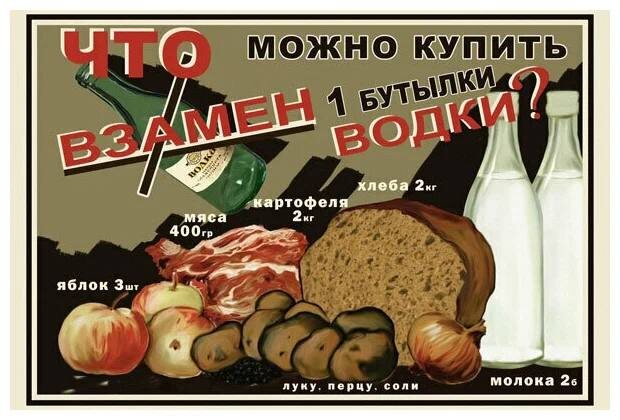 Сразу оговорюсь, статья носит исключительно развлекательный характер,а все приведённые тут цены были актуальны на состояние января 2024 года, так что данная "статистика" уже устарела. Но пофантазировать всё равно можно. Время создания этого советского плаката - 1929 год, и стало интересно, а что если его перенести на нынешние реалии и посчитать что сегодня, почти 100 лет спустя, можно купить на стоимость условной «пол литры»?) Итак, самая низкая цена на 0,5 водки с учетом поднятия на нее цен на 7% по просьбе Минфина в 2024 году составит 281 рубль и речь идёт о минимальной рекомендованной цене! То есть ниже этой суммы пол-литру продавать просто нельзя! На этот 281 рубль можно будет купить (считаем по среднему, информация с сайта inflatio.ru: - хлеб (43 рубля) - 6,5 буханок - говядина (520 руб) - пол-кило - картофель (24 руб) - 11,7 кг. - яйцо куриное (127 руб) - 2 десятка - молоко (76 руб) - 3,6 литра - курица (232 руб) - 1,2 тушки - ну и куда же русский человек без авокадо (115 руб.)