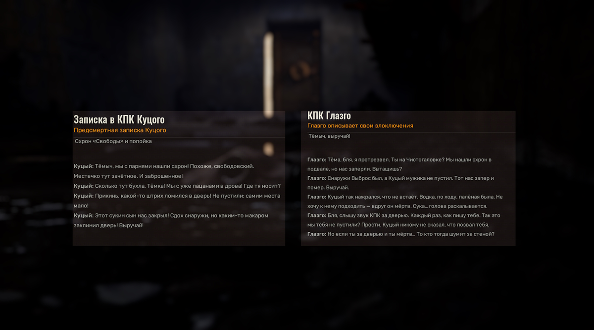 Просто восторг в каждом метре на карте, такое мое мнение. Хоть что скажите, но погружение в игре просто космическое, каждая деталька со смыслом. Делаю лютый эксплоринг Зоны, нарвался на очередной тайник. Погреб, с дверью заблокированной трубой с улицы, а рядом труп сталкера. В щель видно внутри схрон, патроны, стволы и артефакт. Трубу убрать не получается, тяжеловато. Нашел обвал немного поодаль от погреба, спустился, прошелся по короткому коридору в земле и вышел на кирпичный проем, заползаю, там куча трупов, вокруг бутылки с водкой и дальше по коридору та самая дверь. На трупах КПК: Напоминаю про свой телеграм, подписывайся, там много контента!